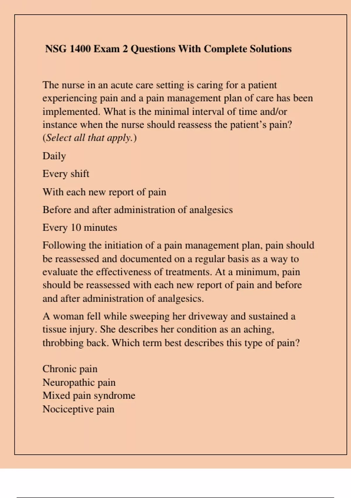 instance when the nurse should reassess the patient’s pain?