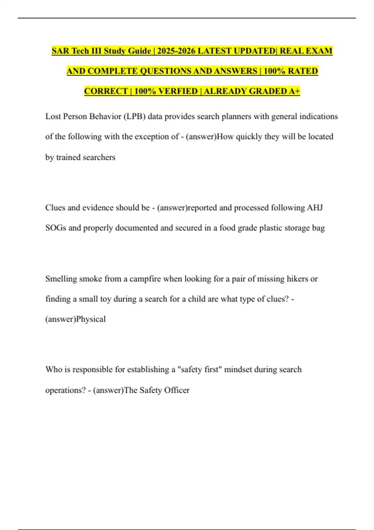 SAR Tech III Study Guide | LATEST UPDATED| REAL EXAM AND COMPLETE QUESTIONS AND ANSWERS | 100% RATED CORRECT | 100% VERFIED | ALREADY GRADED A+