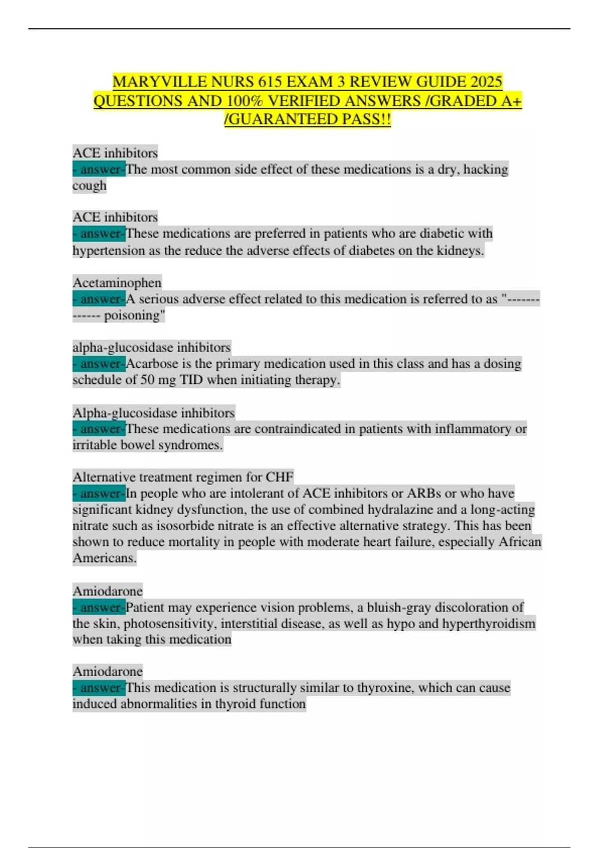 Master NURS 615 Exam 3 with This 2025 Review Guide – 100% Pass Guarantee! This comprehensive study guide is your ultimate resource for Maryville University’s NURS 615 Pharmacology Exam 3, featuring 100% verified questions and answers on cardiac, diabetes, and endocrine medications—updated for 2025 standards. Why This Guide Dominates: Exam-Focused Content: Covers ACE inhibitors (dry cough, renal protection in diabetics), insulin types (rapid/short/long-acting), and statins (rhabdomyolysis risk). High-Yield Clinical Pearls: Amiodarone: Thyroid dysfunction + bluish skin discoloration Metformin: Lactic acidosis warning (check Cr annually) Levothyroxine: Take on empty stomach; monitor TSH Colchicine: Severe diarrhea = dose reduction needed Black Box Warnings: TZDs: Heart failure & bladder cancer risk NSAIDs: CV thrombotic events + GI bleeding Visual Aids: Drug comparison tables, onset/peak/duration charts for insulins, and mnemonics for DKA symptoms (Kussmaul’s, fruity breath).