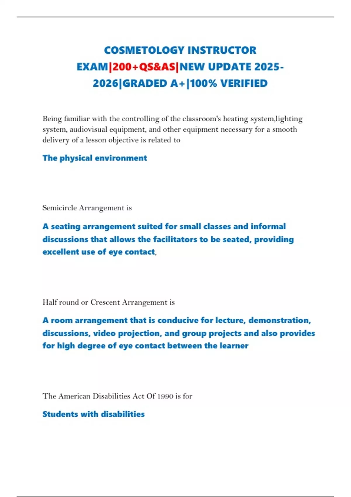 COSMETOLOGY INSTRUCTOR EXAM|200+QS&AS|NEW UPDATE |GRADED A+|100% VERIFIED