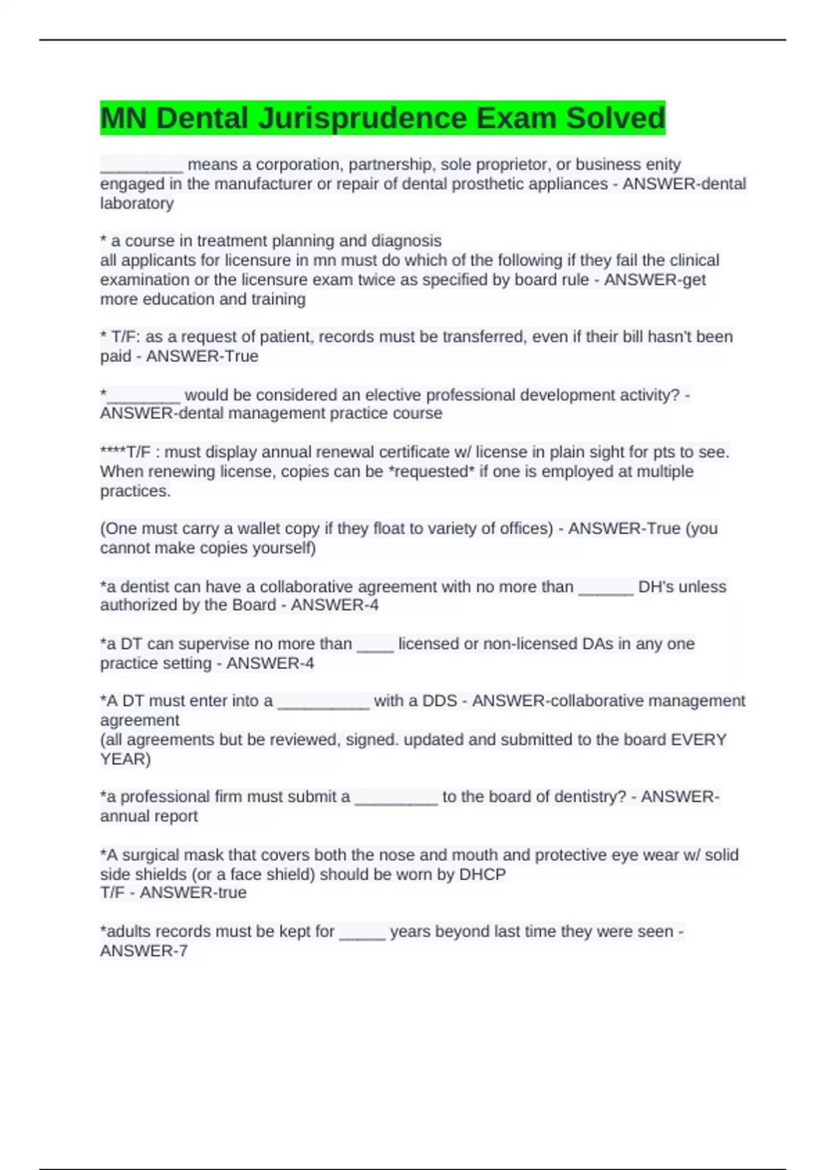 MN Dental Jurisprudence Exam Solved