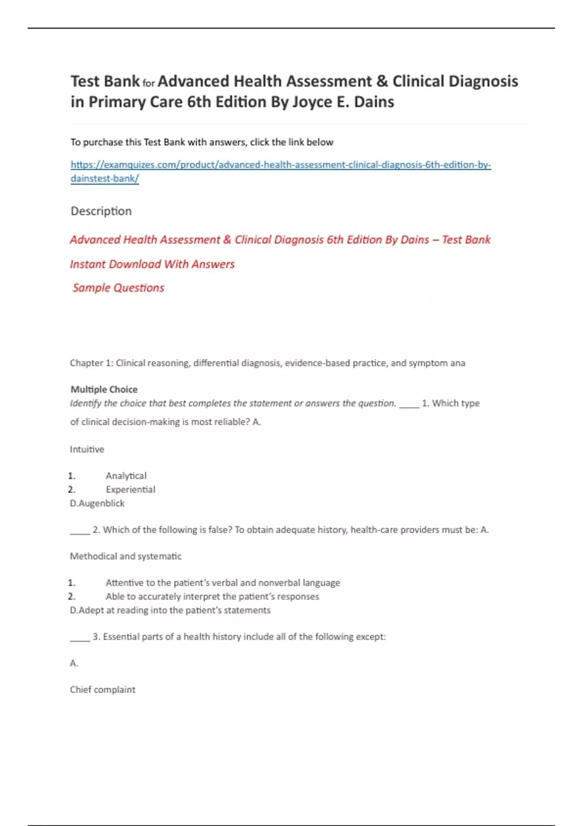 Advanced Health Assessment & Clinical Diagnosis 6th Edition By Dains – Test Bank