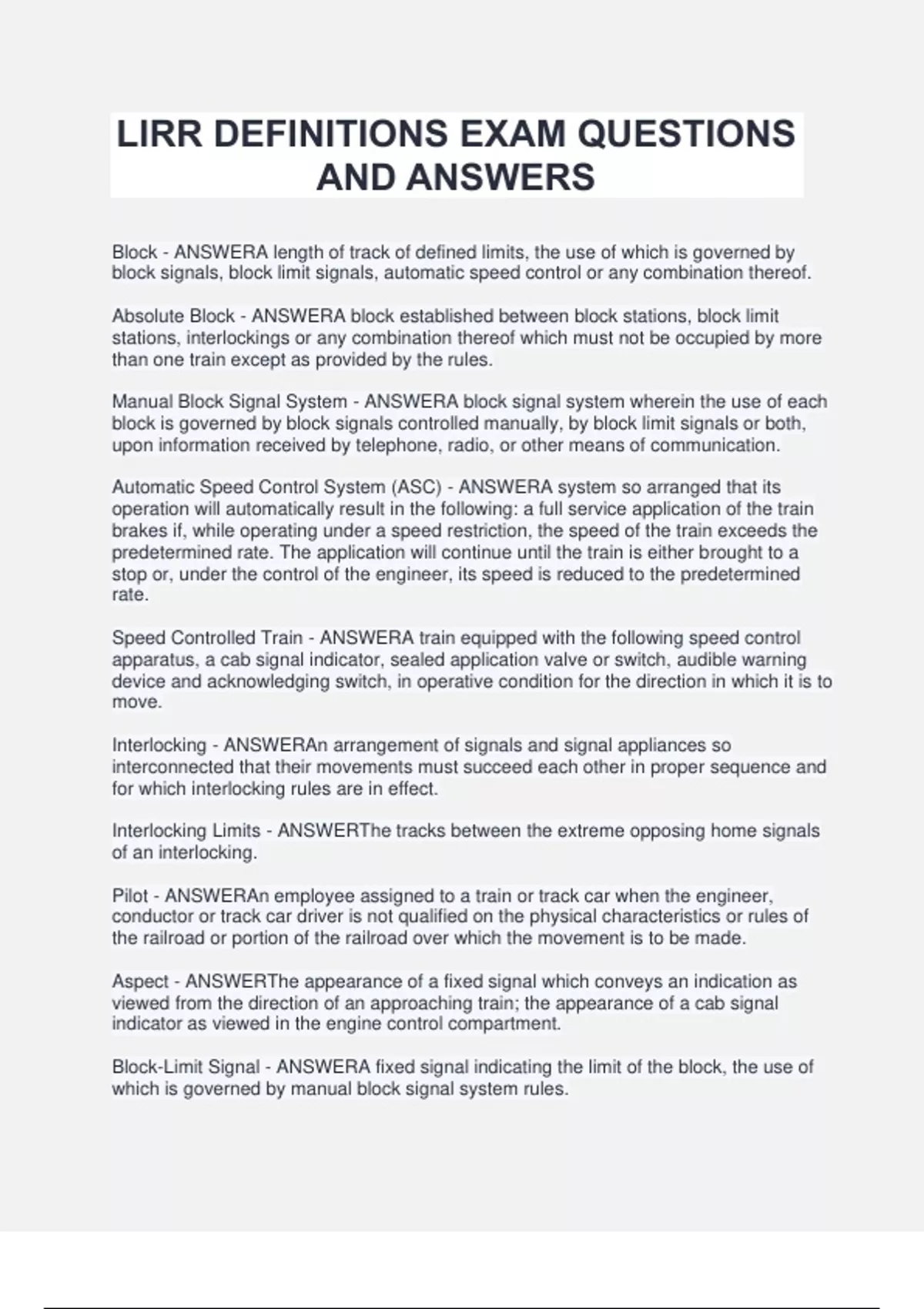 LIRR DEFINITIONS EXAM QUESTIONS AND ANSWERS