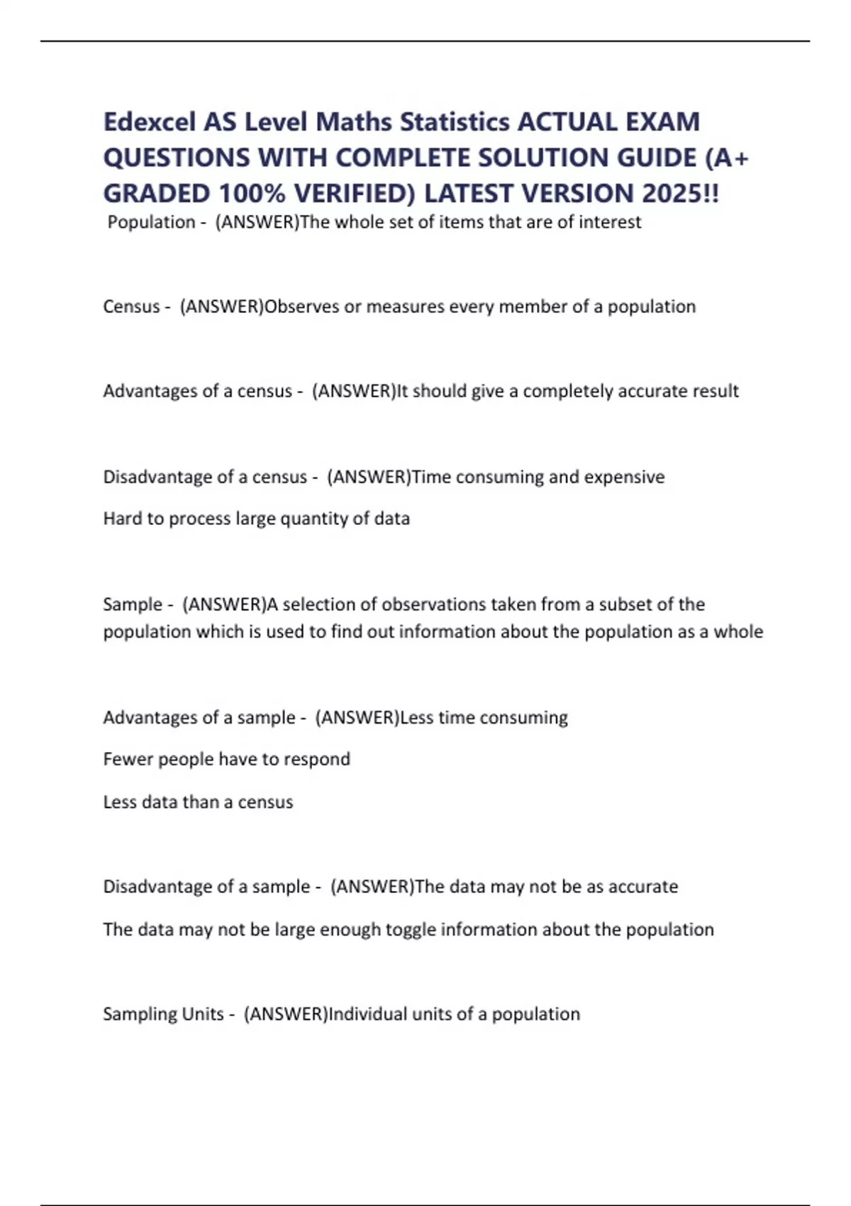 Edexcel AS Level Maths Statistics ACTUAL EXAM QUESTIONS WITH COMPLETE SOLUTION GUIDE (A+ GRADED 100% VERIFIED) LATEST VERSION 2025!!