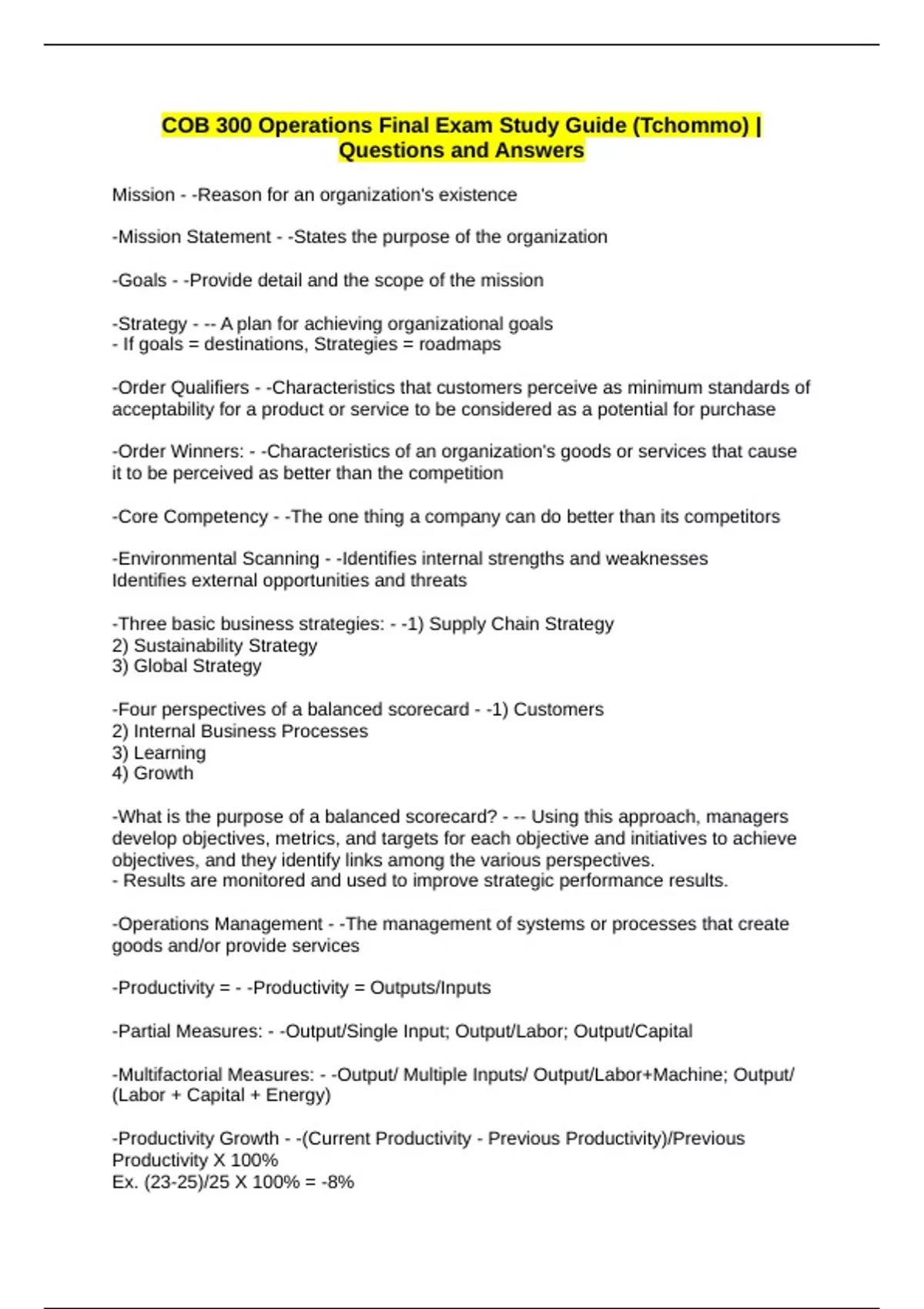 COB 300 Operations Final Exam Study Guide (Tchommo) |