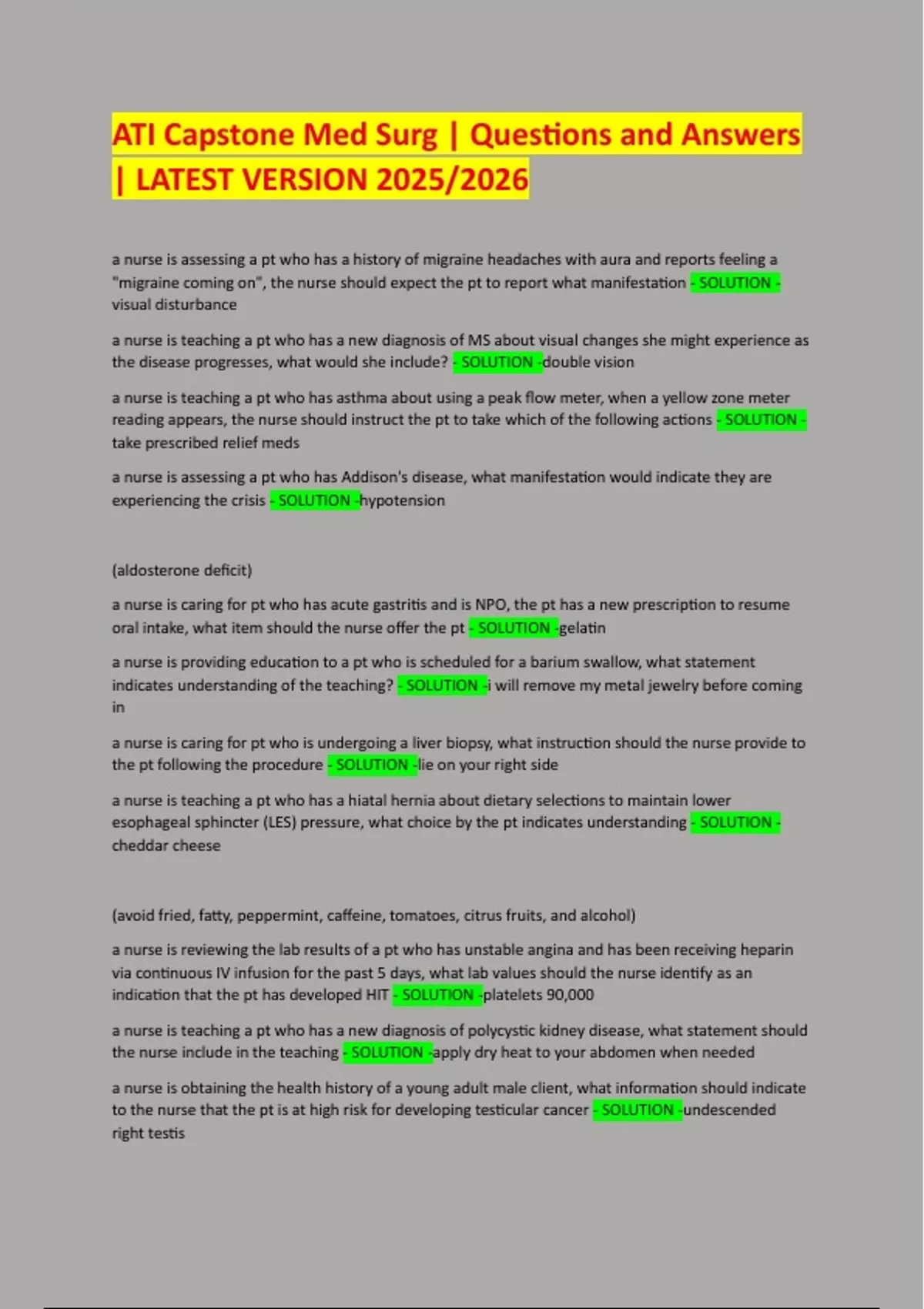 ATI Capstone Med Surg | Questions and Answers | LATEST VERSION 2025/2026 a nurse is assessing a pt who has a history of migraine headaches with aura and reports feeling a "migraine coming on", the nurse should expect the pt to report what manifestation - SOLUTION visual disturbance a nurse is teaching a pt who has a new diagnosis of MS about visual changes she might experience as the disease progresses, what would she include? - SOLUTION -double vision a nurse is teaching a pt who has asthma about using a peak flow meter, when a yellow zone meter reading appears, the nurse should instruct the pt to take which of the following actions - SOLUTION take prescribed relief meds a nurse is assessing a pt who has Addison's disease, what manifestation would indicate they are experiencing the crisis - SOLUTION -hypotension (aldosterone deficit) a nurse is caring for pt who has acute gastritis and is NPO, the pt has a new prescription to resume