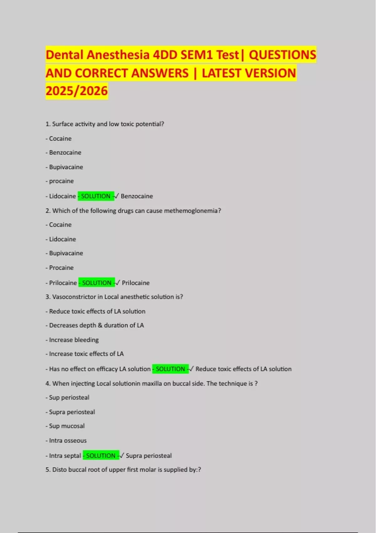 Dental Anesthesia 4DD SEM1 Test| QUESTIONS AND CORRECT ANSWERS | LATEST VERSION 2025/2026 1. Surface activity and low toxic potential? - Cocaine - Benzocaine - Bupivacaine - procaine - Lidocaine - SOLUTION - Benzocaine 2. Which of the following drugs can cause methemoglonemia? - Cocaine - Lidocaine - Bupivacaine - Procaine - Prilocaine - SOLUTION - Prilocaine 3. Vasoconstrictor in Local anesthetic solution is? - Reduce toxic effects of LA solution - Decreases depth & duration of LA - Increase bleeding - Increase toxic effects of LA - Has no effect on efficacy LA solution - SOLUTION - Reduce toxic effects of LA solution