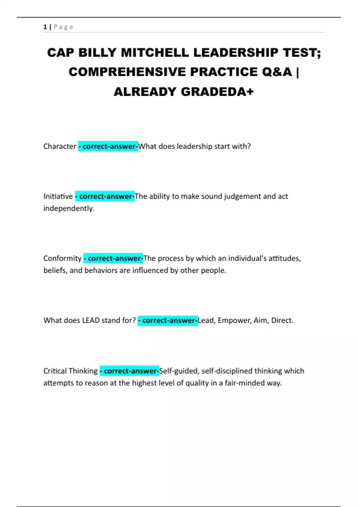 CAP BILLY MITCHELL LEADERSHIP TEST; COMPREHENSIVE PRACTICE Q&A | ALREADY GRADEDA+