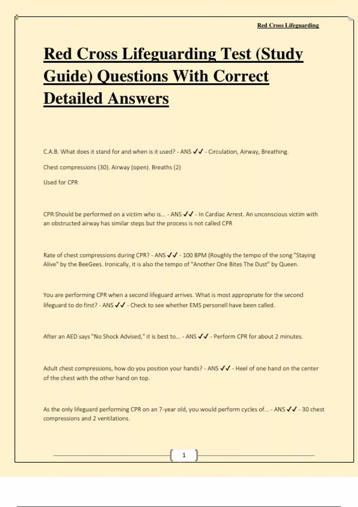 C.A.B. What does it stand for and when is it used? - ANS - Circulation, Airway, Breathing. Chest compressions (30). Airway (open). Breaths (2) Used for CPR CPR Should be performed on a victim who is... - ANS - In Cardiac Arrest. An unconscious victim with an obstructed airway has similar steps but the process is not called CPR Rate of chest compressions during CPR? - ANS - 100 BPM (Roughly the tempo of the song "Staying Alive" by the BeeGees. Ironically, it is also the tempo of "Another One Bites The Dust" by Queen. You are performing CPR when a second lifeguard arrives. What is most appropriate for the second lifeguard to do first? - ANS - Check to see whether EMS personell have been called.