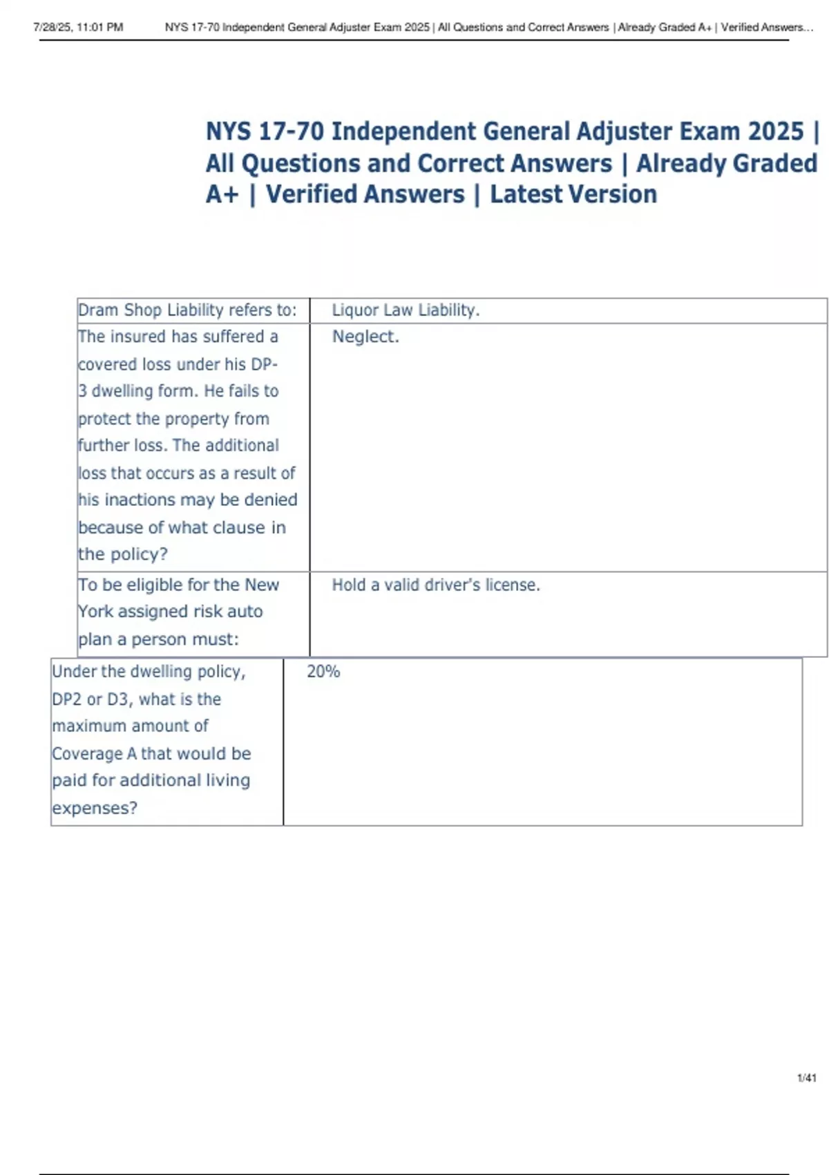, 7/28/25, 11:01 PM NYS 17-70 Independent General Adjuster Exam 2025 | All Questions and Correct Answers | Already Graded A+ | Verified Answers…