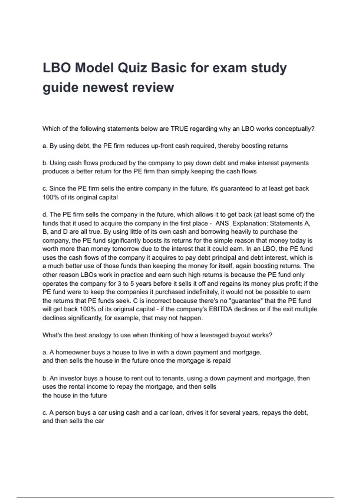 an income-generating asset. So it is not the best way to think of an LBO. C is incorrect because