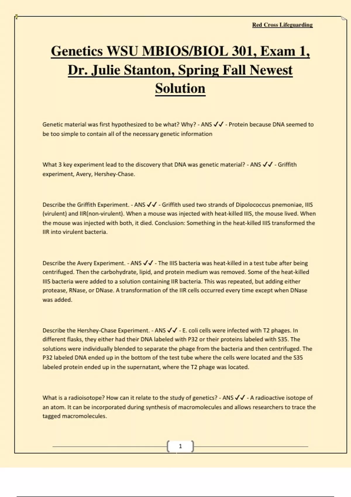 Genetics WSU MBIOSBIOL 301, Exam 1, Dr. Julie Stanton, Spring Fall Newest Solution