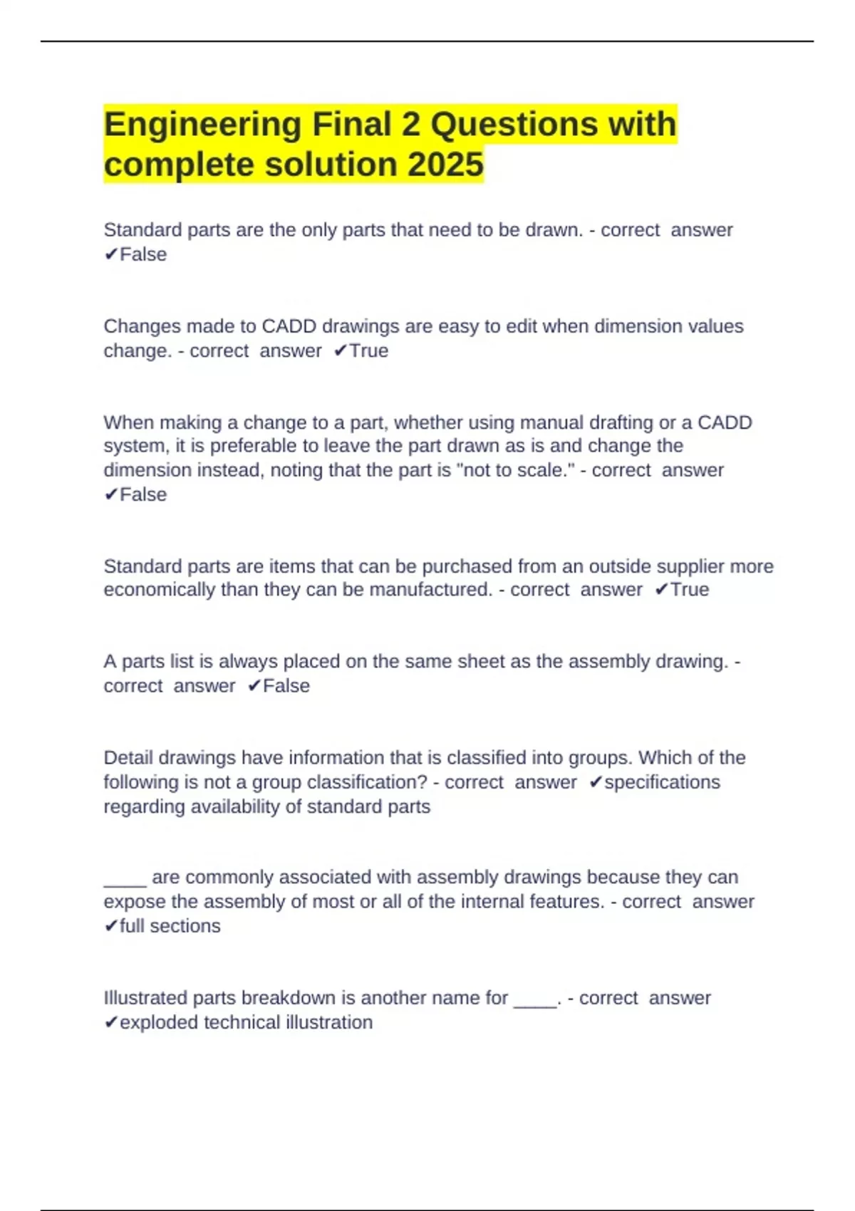 Engineering Final 2 Questions with complete solution 2025 Standard parts are the only parts that need to be drawn. - correct answer False Changes made to CADD drawings are easy to edit when dimension values change. - correct answer True When making a change to a part, whether using manual drafting or a CADD system, it is preferable to leave the part drawn as is and change the dimension instead, noting that the part is "not to scale." - correct answer False Standard parts are items that can be purchased from an outside supplier more economically than they can be manufactured. - correct answer True A parts list is always placed on the same sheet as the assembly drawing. - correct answer False Detail drawings have information that is classified into groups. Which of the following is not a group classification? - correct answer specifications regarding availability of standard parts ____ are commonly associated with assembly drawings because they can expose the assembly of most or all of the internal features. - correct answer full sections Illustrated parts breakdown is another name for ____. - correct answer exploded technical illustration