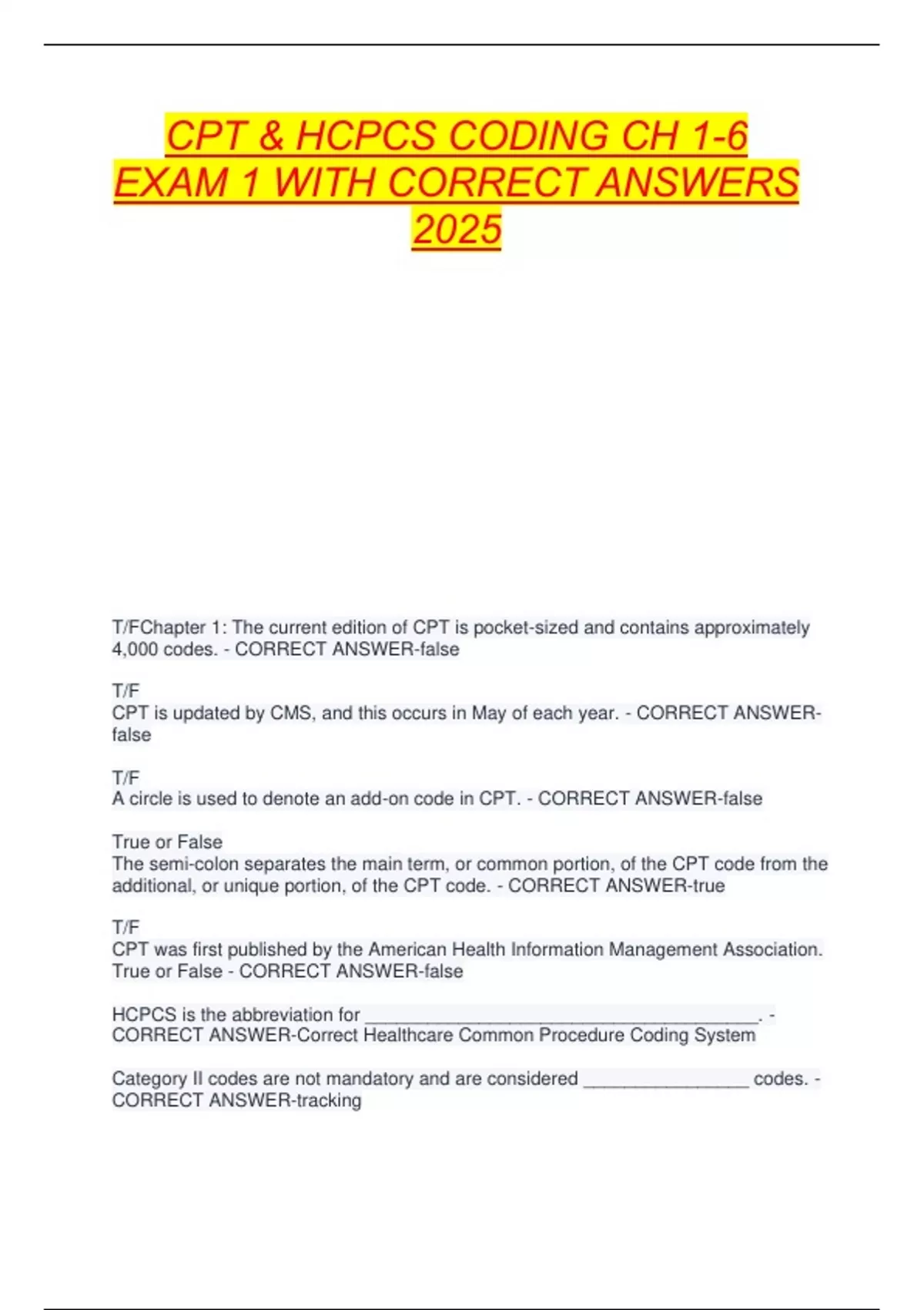 CPT & HCPCS CODING CH 1-6 EXAM 1 WITH CORRECT ANSWERS 2025