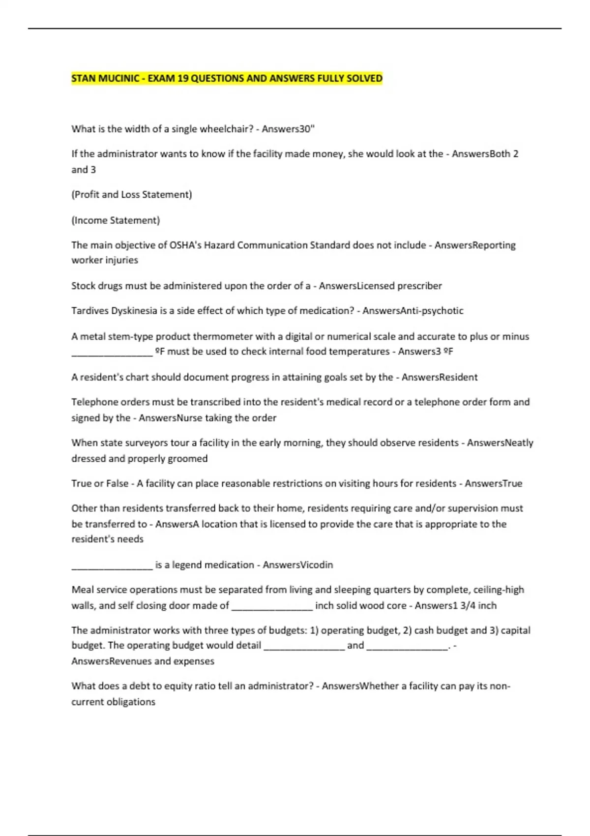 STAN MUCINIC - EXAM 19 QUESTIONS AND ANSWERS FULLY SOLVED What is the width of a single wheelchair? - Answers30" If the administrator wants to know if the facility made money, she would look at the - AnswersBoth 2 and 3 (Profit and Loss Statement) (Income Statement) The main objective of OSHA's Hazard Communication Standard does not include - AnswersReporting worker injuries Stock drugs must be administered upon the order of a - AnswersLicensed prescriber Tardives Dyskinesia is a side effect of which type of medication? - AnswersAnti-psychotic A metal stem-type product thermometer with a digital or numerical scale and accurate to plus or minus _______________ ºF must be used to check internal food temperatures - Answers3 ºF A resident's chart should document progress in attaining goals set by the - AnswersResident Telephone orders must be transcribed into the resident's medical record or a telephone order form and signed by the - AnswersNurse taking the order When state surveyors tour a facility in the early morning, they should observe residents - AnswersNeatly dressed and properly groomed True or False - A facility can place reasonable restrictions on visiting hours for residents - AnswersTrue Other than residents transferred back to their home, residents requiring care and/or supervision must be transferred to - AnswersA location that is licensed to provide the care that is appropriate to the resident's needs _______________ is a legend medication - AnswersVicodin Meal service operations must be separated from living and sleeping quarters by complete, ceiling-high walls, and self closing door made of _______________ inch solid wood core - Answers1 3/4 inch The administrator works with three types of budgets: 1) operating budget, 2) cash budget and 3) capital budget. The operating budget would detail _______________ and _______________. - AnswersRevenues and expenses What does a debt to equity ratio tell an administrator? - AnswersWhether a facility can pay its