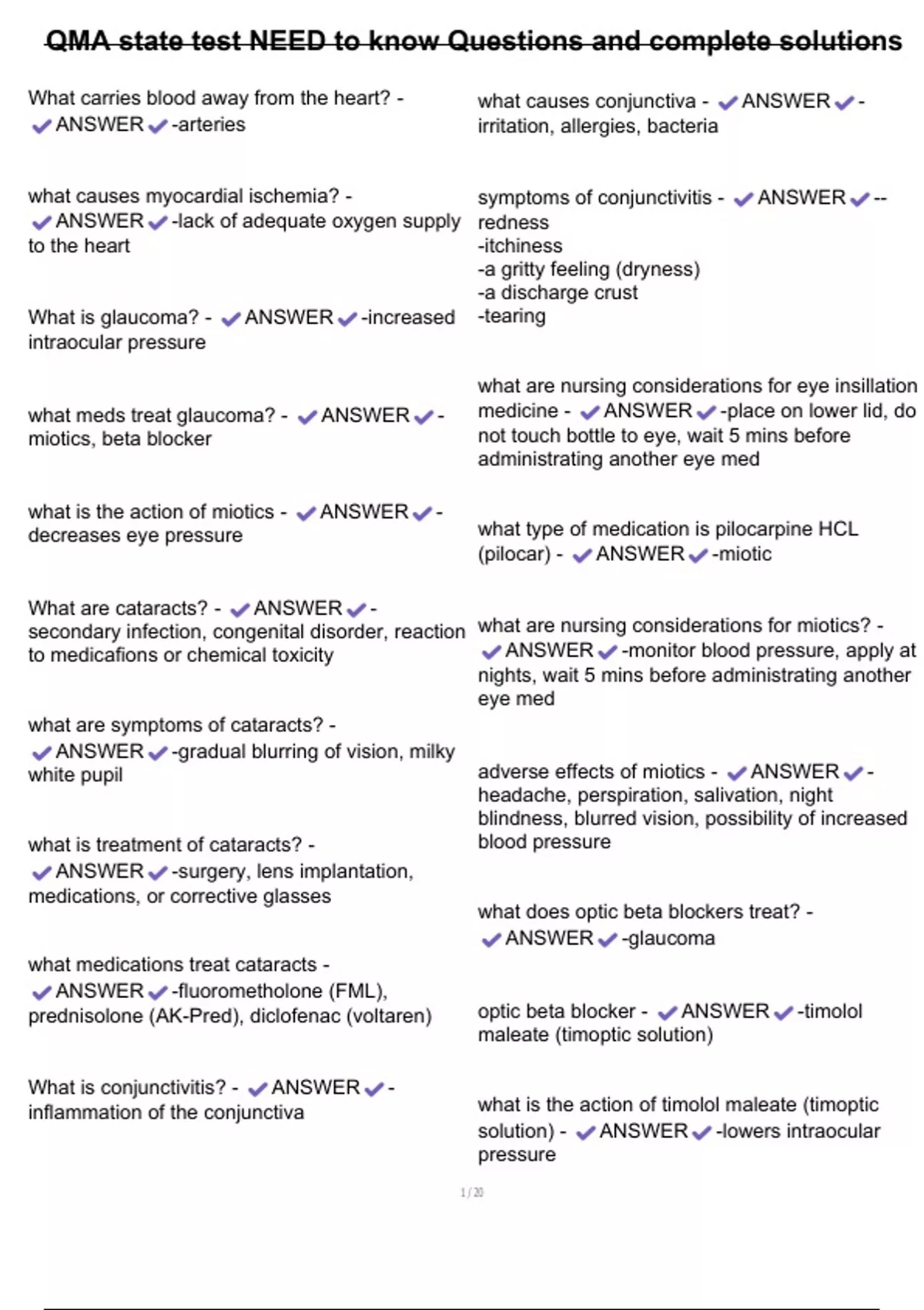 What carries blood away from the heart? - ANSWER -arteries what causes myocardial ischemia? - ANSWER -lack of adequate oxygen supply to the heart What is glaucoma?