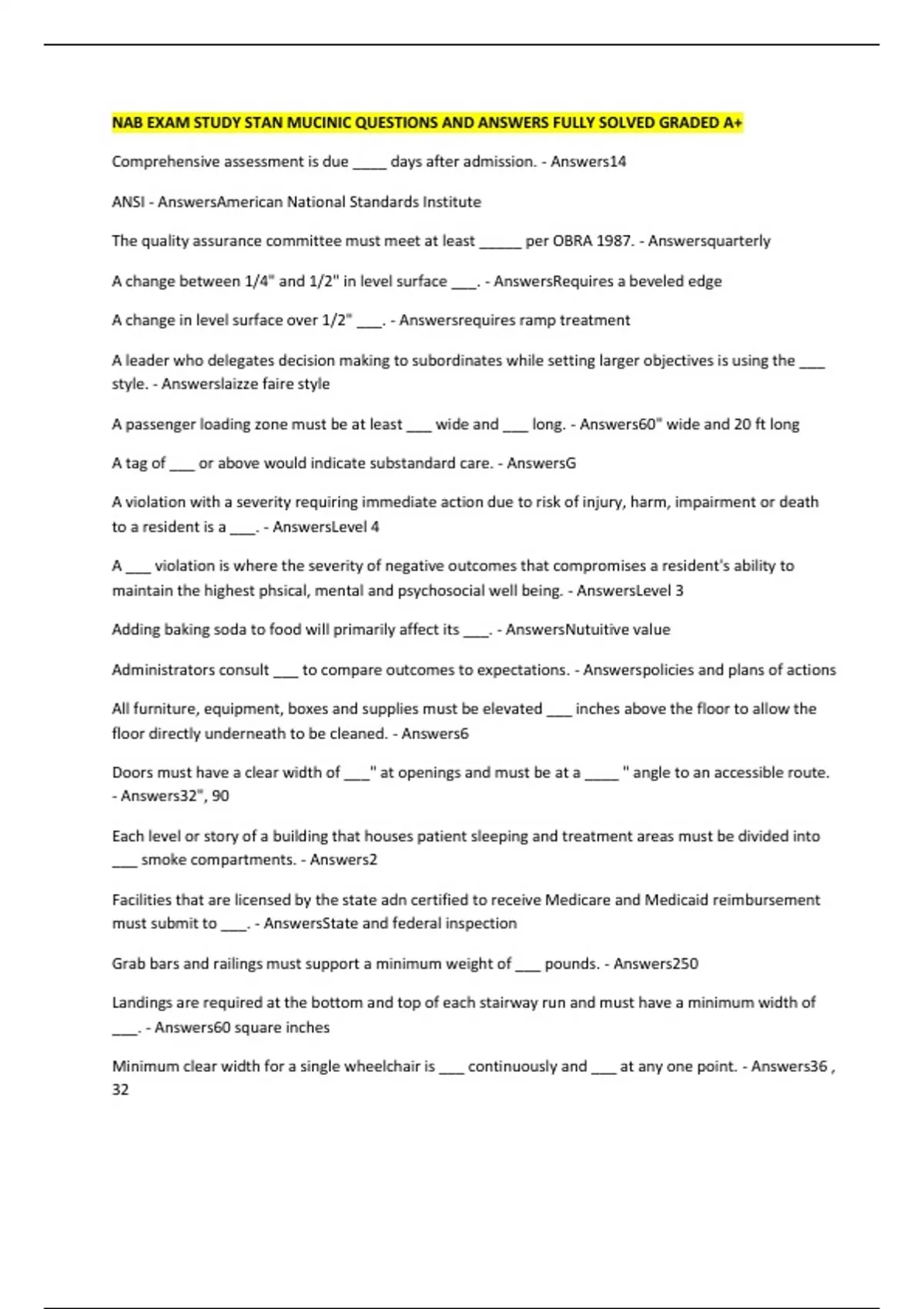NAB EXAM STUDY STAN MUCINIC QUESTIONS AND ANSWERS FULLY SOLVED GRADED A+ Comprehensive assessment is due ____ days after admission. - Answers14 ANSI - AnswersAmerican National Standards Institute The quality assurance committee must meet at least _____ per OBRA 1987. - Answersquarterly A change between 1/4" and 1/2" in level surface ___. - AnswersRequires a beveled edge A change in level surface over 1/2" ___. - Answersrequires ramp treatment A leader who delegates decision making to subordinates while setting larger objectives is using the ___ style. - Answerslaizze faire style A passenger loading zone must be at least ___ wide and ___ long. - Answers60" wide and 20 ft long A tag of ___ or above would indicate substandard care. - AnswersG A violation with a severity requiring immediate action due to risk of injury, harm, impairment or death to a resident is a ___. - AnswersLevel 4 A ___ violation is where the severity of negative outcomes that compromises a resident's ability to maintain the highest phsical, mental and psychosocial well being. - AnswersLevel 3 Adding baking soda to food will primarily affect its ___. - AnswersNutuitive value Administrators consult ___ to compare outcomes to expectations. - Answerspolicies and plans of actions All furniture, equipment, boxes and supplies must be elevated ___ inches above the floor to allow the floor directly underneath to be cleaned. - Answers6 Doors must have a clear width of ___" at openings and must be at a ____ " angle to an accessible route. - Answers32", 90 Each level or story of a building that houses patient sleeping and treatment areas must be divided into ___ smoke compartments. - Answers2 Facilities that are licensed by the state adn certified to receive Medicare and Medicaid reimbursement must submit to ___. - AnswersState and federal inspection Grab bars and railings must support a minimum weight of ___ pounds. - Answers250 Landings are required at the bottom and top of each stairway run and must have a minimum width of ___. - Answers60 square inches Minimum clear width for a single wheelchair is ___ continuously and ___ at any one point. - Answers36 , 32 Minimum wheelchair passing width for two wheelchairs is ___ inches. - Answers60 Non-compliance affecting a limited number of residents and locations would be assigned a scope of ___. - Answersisolated Nursing homes must have hearing aid compatible phones with volume control that can adjust the volume between a minimum of ___ and a maximum of ___ decibels above normal. - Answers12,18 A resident was admitted on June 1. The attending physician charted a visit an physical examiniation on june 27, july 29 and sept 4. The facility ___. - AnswersWas in compliance and would not be cited Parking spaces must be at least ___" wide with an accessible handicap aisle at least __" wide. - Answers96, 60 A resident was only given lunch that day, was given the wrong medication in the morning, had her room changed without notification and was not given a bath as requested. Per OBRA 1987 how many rights were violated? - Answers3 Poer OBRA a resident has the right to review all their records within ___ of an oral or written request (excluding weekends and holidays). - Answers24 hours Smoke detectors must be located no further than ___ feet apart and no m ore than ___ feet from any wall. - Answers30 , 15 The administrator has ___ days to prepare a plan of correction for all deficiencies cited in the survey. - Answers10 The Americans with disabilities Act construction standards were developed by ___. - AnswersANSI The comprehensive assessment must be signed by ___ - AnswersRN The comprehensive assessment was completed on june 1. The care plan was completed on June 6th. The care plan was completed ____. - Answerstimely