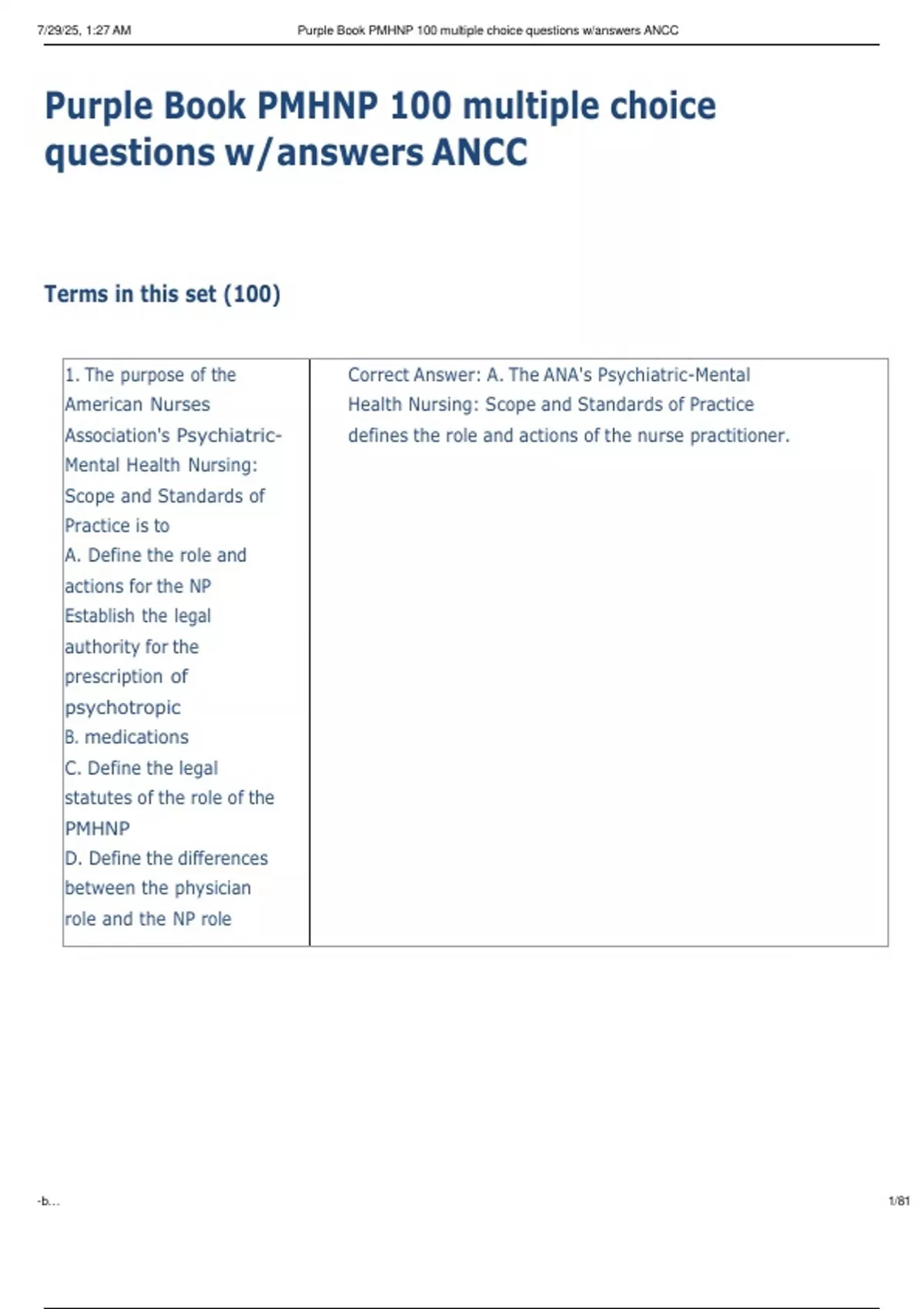 , 7/29/25, 1:27 AM Purple Book PMHNP 100 multiple choice questions w/answers ANCC