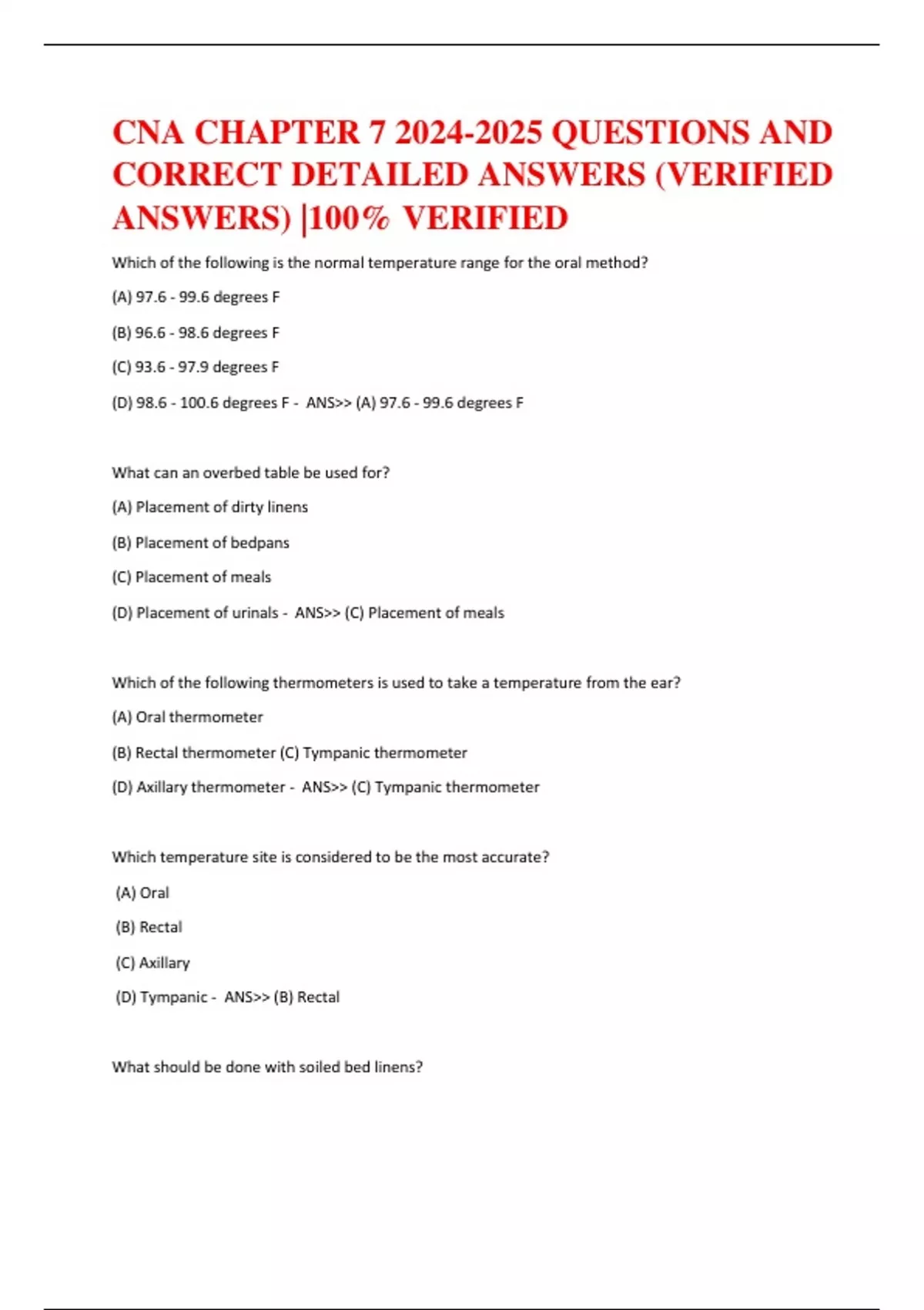 Master clinical skills with this 100% verified study guide for CNA Chapter 7 (), covering essential procedures and protocols. Key topics include: Vital signs measurement (normal ranges for temp, pulse, respiration, BP) Infection control (handling soiled linens, catheter care) Specimen collection (clean-catch urine, converting oz to mL) Medical equipment (tympanic thermometers, oxygen concentrators) Pain management & restraints (alternatives, proper documentation) Each answer includes detailed explanations to ensure accuracy for exams and real-world application.