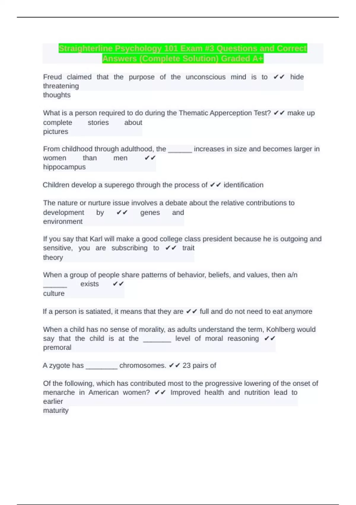 Straighterline Psychology 101 Exam #3 Questions and Correct