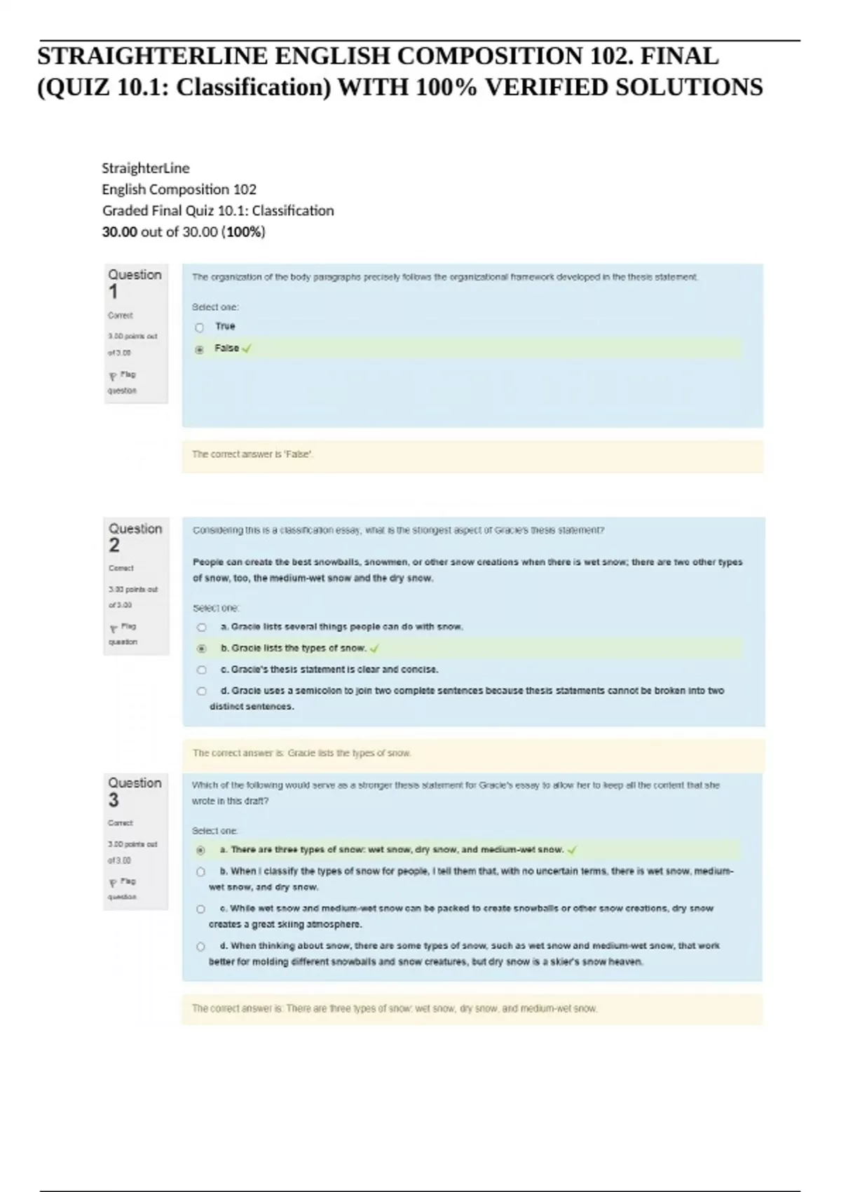 STRAIGHTERLINE ENGLISH COMPOSITION 102. FINAL (QUIZ 10.1: Classification) WITH 100% VERIFIED SOLUTIONS