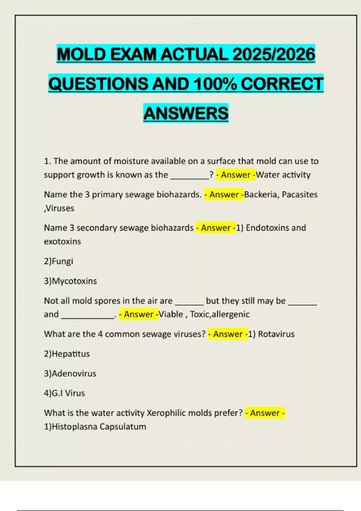 MOLD EXAM ACTUAL 2025/2026 QUESTIONS AND 100% CORRECT ANSWERS 1. The amount of moisture available on a surface that mold can use to support growth is known as the ________? - Answer -Water activity Name the 3 primary sewage biohazards. - Answer -Backeria, Pacasites ,Viruses Name 3 secondary sewage biohazards - Answer -1) Endotoxins and exotoxins 2)Fungi 3)Mycotoxins Not all mold spores in the air are ______ but they still may be ______ and ___________. - Answer -Viable , Toxic,allergenic What are the 4 common sewage viruses? - Answer -1) Rotavirus 2)Hepatitus 3)Adenovirus 4)G.I Virus What is the water activity Xerophilic molds prefer? - Answer - 1)Histoplasna Capsulatum2)Cryptococcus Define the term Pathogenic? - Answer -Causes disease in humans What federal agency governs indoor air quality? - Answer -None What category of water damage can support mold and bacterial growth? - Answer -All What is the definition of Category 3 water damage and provide 4 examples. - Answer -water Contaias pathogenic agents and is grossly unsainitary. 1)Seawater 2)Groundwater 3)Backflow from beyond the trap 4)Sewage What are the factors that affect mold growth? - Answer -1)Temperature 2)oxygen 3) Ph 4)Nutrients 5)