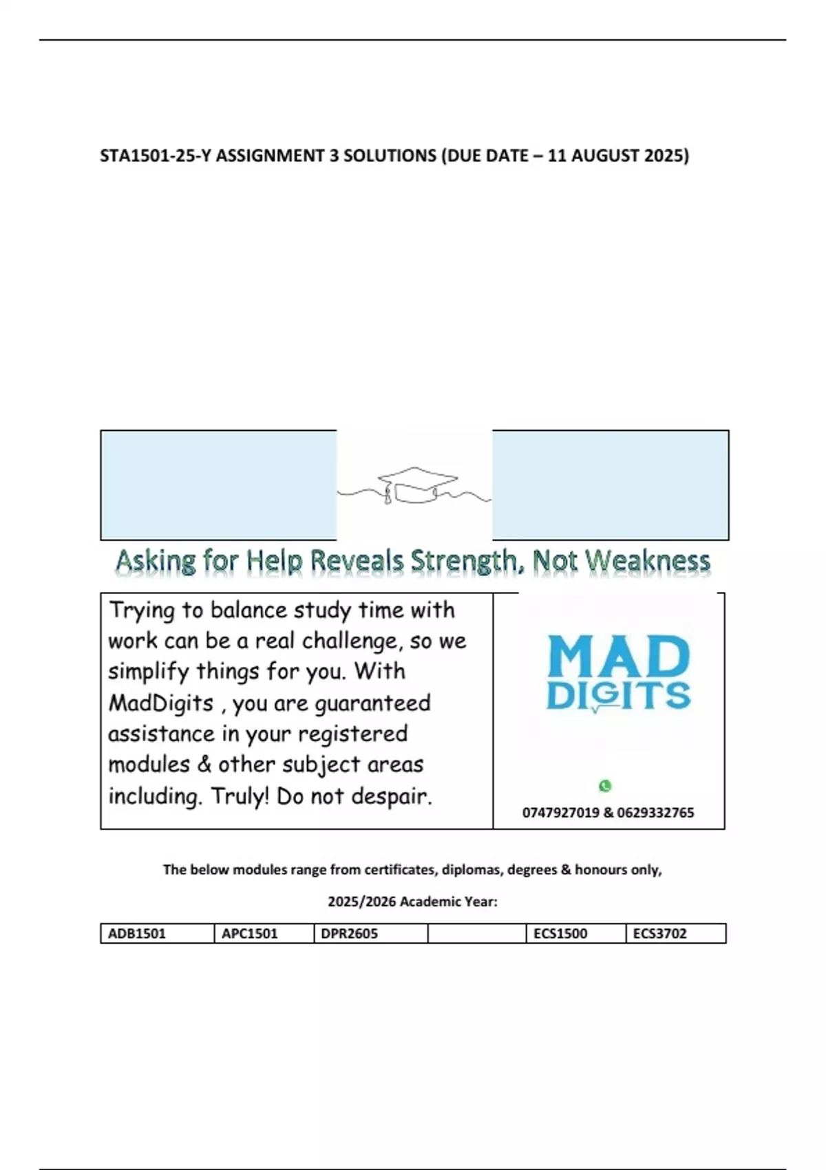 STA1501-25-Y ASSIGNMENT 3 SOLUTIONS (DUE DATE – 11 AUGUST 2025)