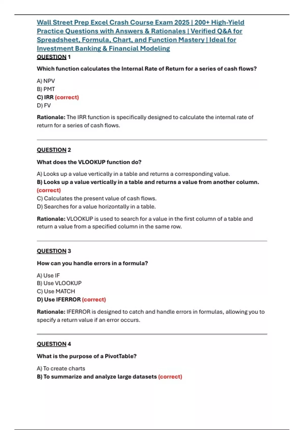 Wall Street Prep Excel Crash Course Exam 2025 | 200+ High-Yield Practice Questions with Answers & Rationales | Verified Q&A for Spreadsheet, Formula, Chart, and Function Mastery | Ideal for Investment Banking & Financial Modeling