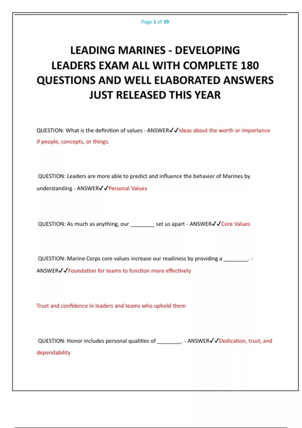 LEADING MARINES - DEVELOPING LEADERS EXAM ALL WITH COMPLETE 180 QUESTIONS AND WELL ELABORATED ANSWERS JUST RELEASED THIS YEAR