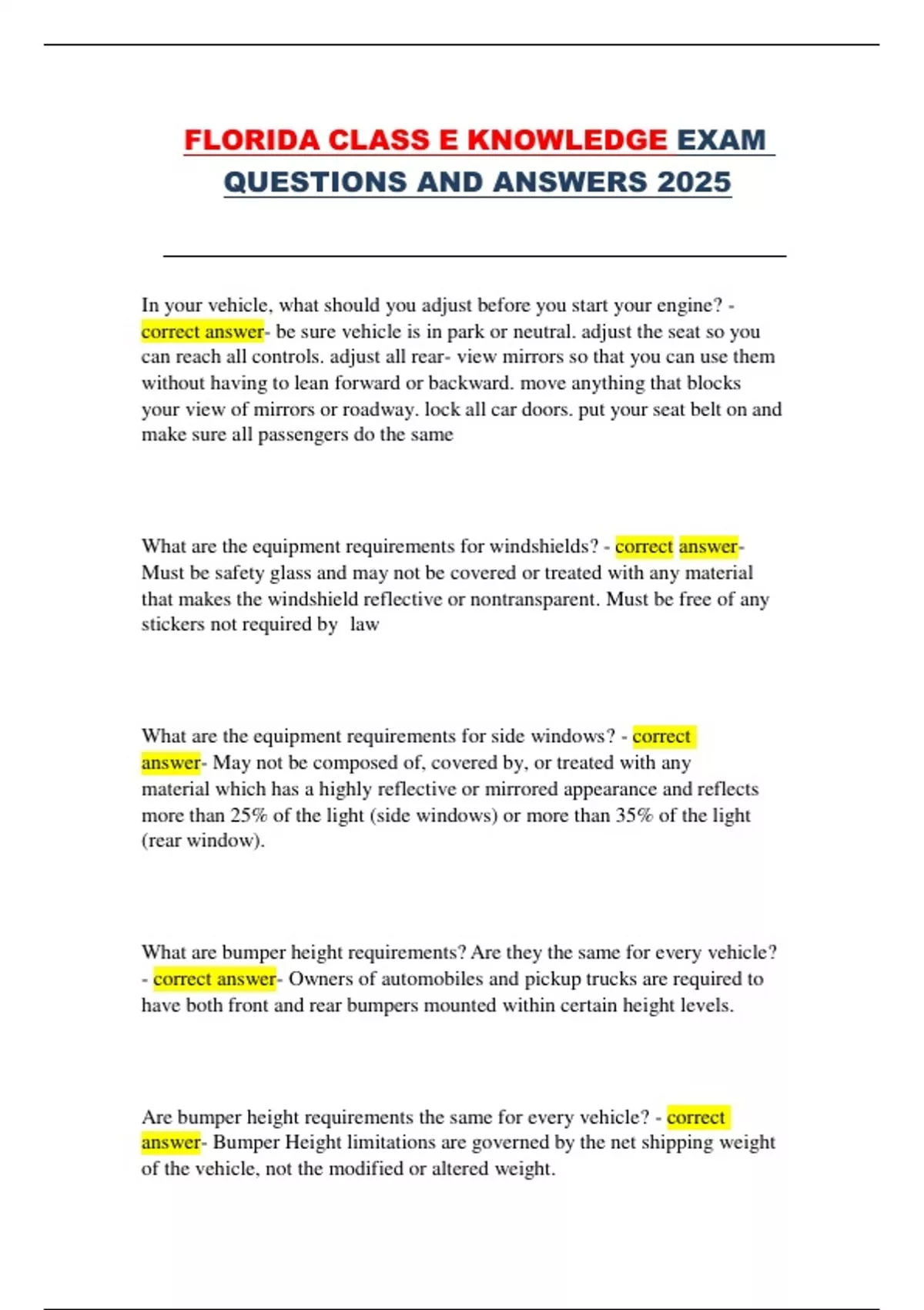 FLORIDA CLASS E KNOWLEDGE EXAM QUESTIONS AND ANSWERS 2025