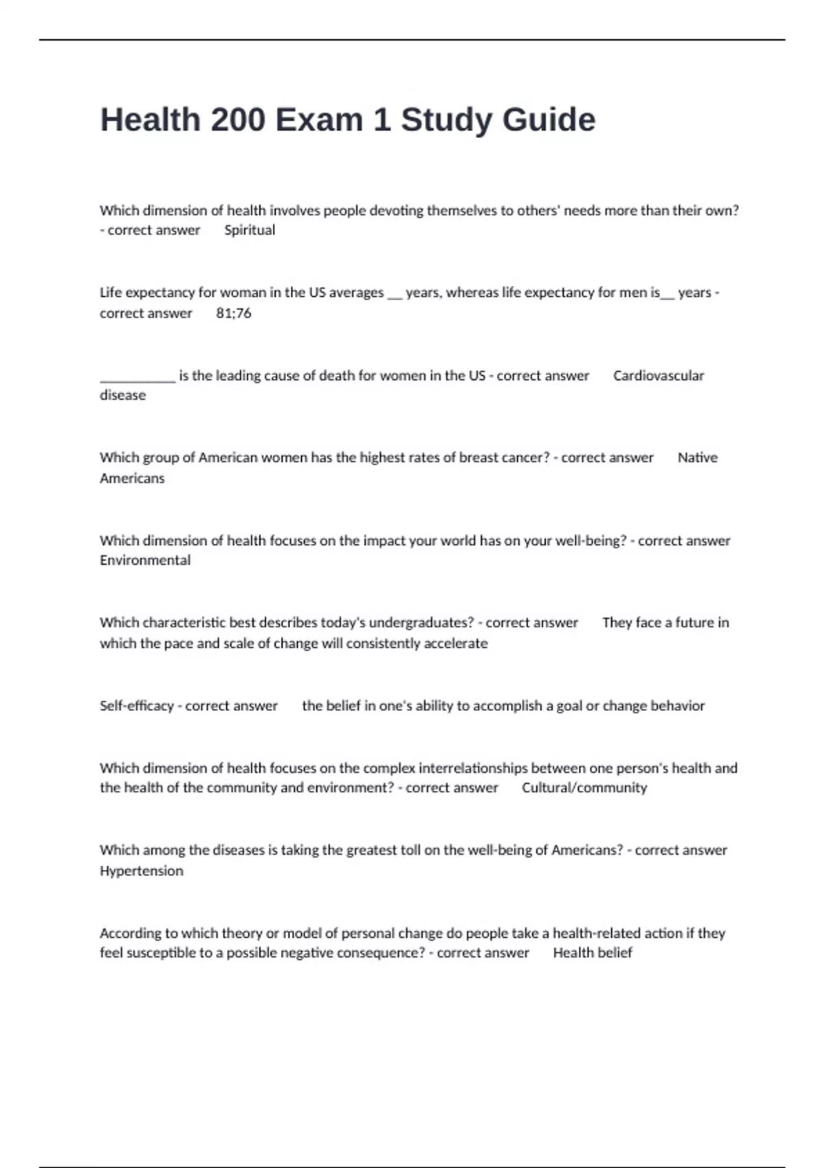 Health 200 Exam 1 Study Guide Prep Questions And Correct Answers With Detailed Rationales.