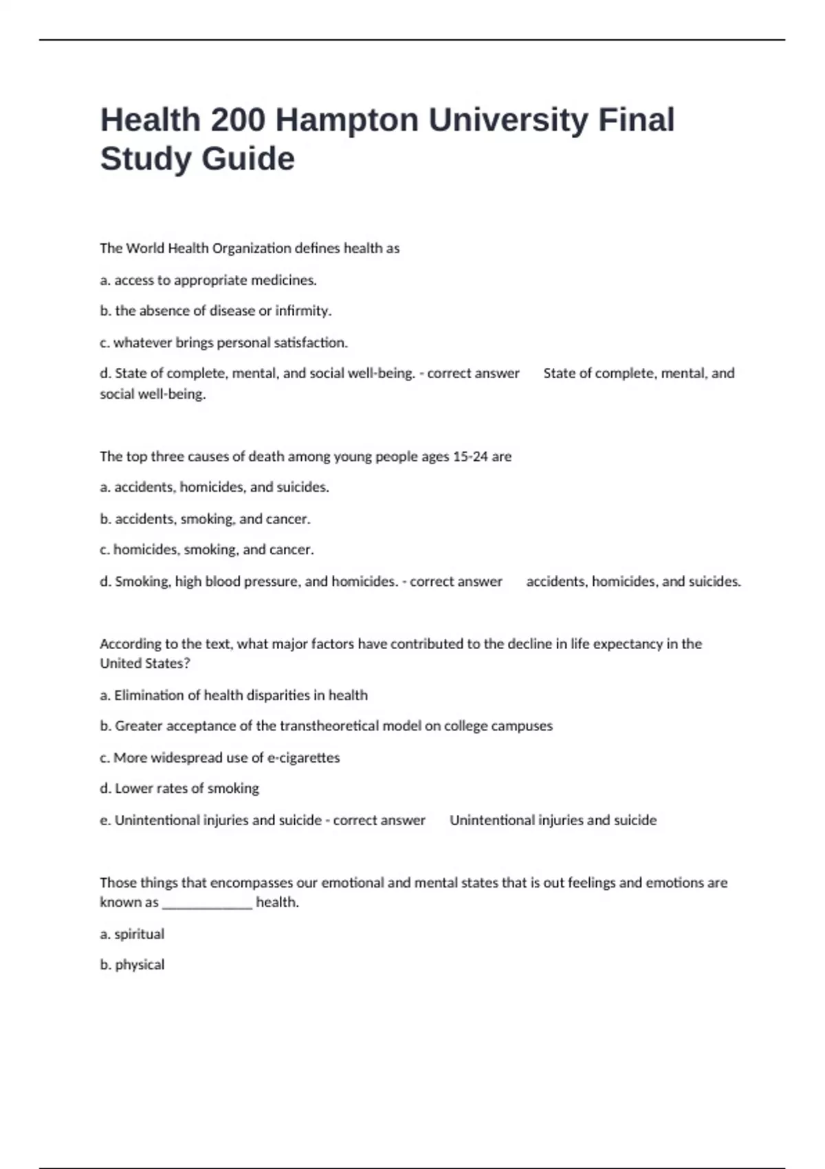 d. State of complete, mental, and social well-being. - correct answer State of complete, mental, and