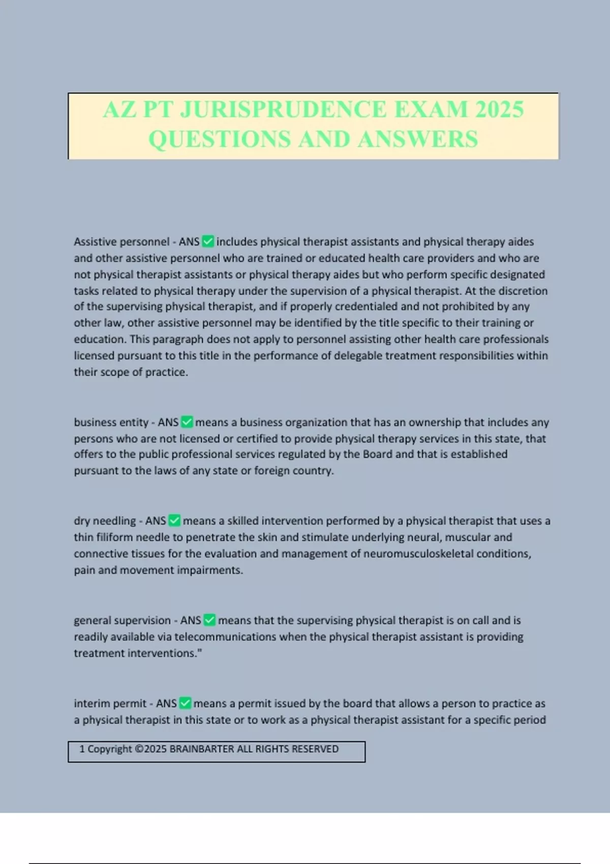 Assistive personnel - ANS includes physical therapist assistants and physical therapy aides and other assistive personnel who are trained or educated health care providers and who are not physical therapist assistants or physical therapy aides but who perform specific designated tasks related to physical therapy under the supervision of a physical therapist. At the discretion of the supervising physical therapist, and if properly credentialed and not prohibited by any other law, other assistive personnel may be identified by the title specific to their training or education. This paragraph does not apply to personnel assisting other health care professionals licensed pursuant to this title in the performance of delegable treatment responsibilities within their scope of practice. business entity - ANS means a business organization that has an ownership that includes any persons who are not licensed or certified to provide physical therapy services in this state, that offers to the public professional services regulated by the Board and that is established pursuant to the laws of any state or foreign country. dry needling - ANS means a skilled intervention performed by a physical therapist that uses a thin filiform needle to penetrate the skin and stimulate underlying neural, muscular and connective tissues for the evaluation and management of neuromusculoskeletal conditions, pain and movement impairments. general supervision - ANS means that the supervising physical therapist is on call and is readily available via telecommunications when the physical therapist assistant is providing treatment interventions." interim permit - ANS means a permit issued by the board that allows a person to practice as a physical therapist in this state or to work as a physical therapist assistant for a specific period AZ PT JURISPRUDENCE EXAM 2025 QUESTIONS AND ANSWERS 2 Copyright ©2025 BRAINBARTER ALL RIGHTS RESERVED of time and under conditions prescribed by the board before that person is issued a license or certificate. manual therapy techniques - ANS means a broad group of passive interventions in which physical therapists use their hands to administer skilled movements designed to modulate pain, increase joint range of motion, reduce or eliminate soft tissue swelling, inflammation, or restriction, induce relaxation, improve contractile and noncontractile tissue extensibility, and improve pulmonary function. These interventions involve a variety of techniques, such as the application of graded forces. on-site supervision - ANS eans that the supervising physical therapist is on site and is present in the facility or on the campus where assistive personnel or a holder of an interim permit is performing services, is immediately available to assist the person being supervised in the services being performed and maintains continued involvement in appropriate aspects of each treatment session in which a component of treatment is delegated. practice of physical therapy - ANS (a) Examining, evaluating and testing persons who have mechanical, physiological and developmental impairments, functional limitations and disabilities or other health and movement related conditions in order to determine a diagnosis, a prognosis and a plan of therapeutic intervention and to assess the ongoing effects of intervention. (b) Alleviating impairments and functional limitations by managing, designing, implementing and modifying therapeutic interventions including: (i) Therapeutic exercise. (ii) Functional training in self-care and in home, community or work reintegration. (iii) Manual therapy techniques. (iv) Therapeutic massage. (v) Assistive and adaptive orthotic, prosthetic, protective and supportive devices and equipment. (vi) Pulmonary hygiene. (vii) Debridement and wound care. (viii) Physical agents or modalities. (ix) Mechanical and electro