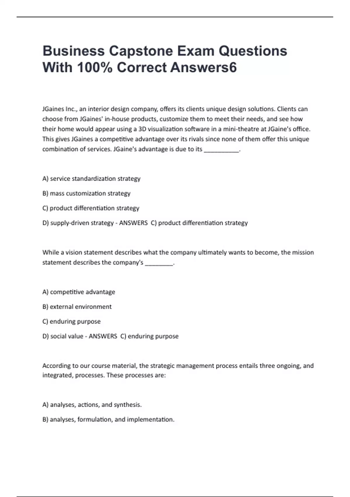 Business Capstone Exam Questions With 100% Correct Answers JGaines Inc., an interior design company, offers its clients unique design solutions. Clients can choose from JGaines' in-house products, customize them to meet their needs, and see how their home would appear using a 3D visualization software in a mini-theatre at JGaine's office. This gives JGaines a competitive advantage over its rivals since none of them offer this unique combination of services. JGaine's advantage is due to its __________. A) service standardization strategy B) mass customization strategy C) product differentiation strategy D) supply-driven strategy - ANSWERS C) product differentiation strategy While a vision statement describes what the company ultimately wants to become, the mission statement describes the company's ________. A) competitive advantage B) external environment C) enduring purpose D) social value - ANSWERS C) enduring purpose According to our course material, the strategic management process entails three ongoing, and integrated, processes. These processes are: A) analyses, actions, and synthesis. B) analyses, formulation, and implementation.
