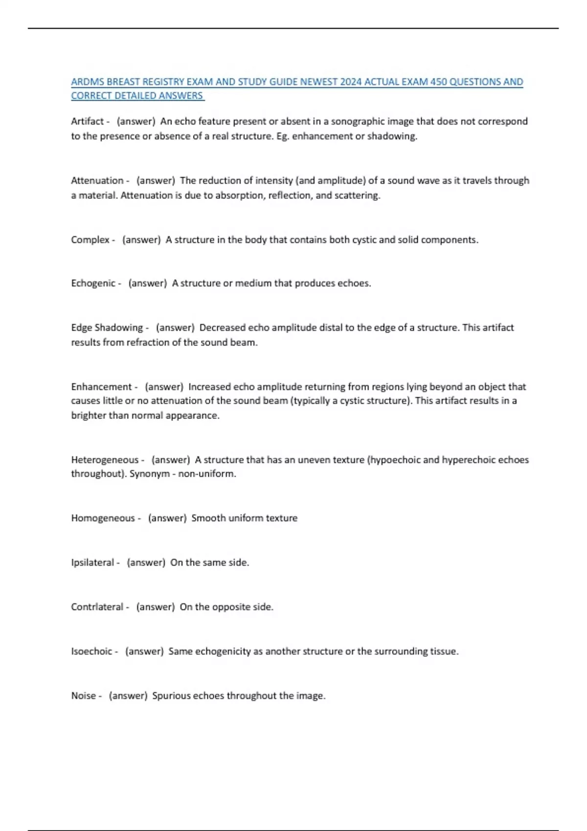 ARDMS BREAST REGISTRY EXAM AND STUDY GUIDE NEWEST 2024 ACTUAL EXAM 450 QUESTIONS AND