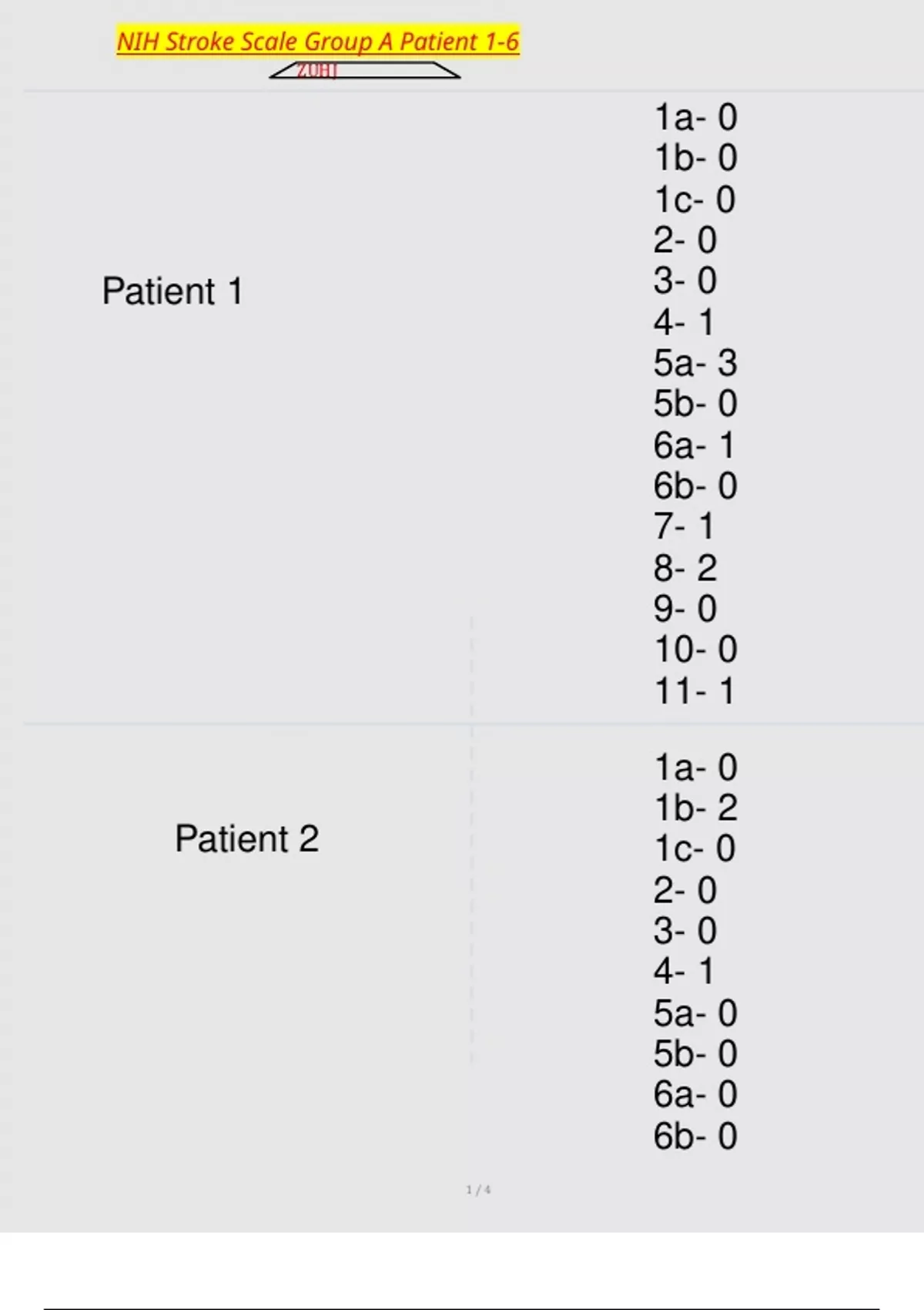 , NIH Stroke Scale Group A Patient 1-6