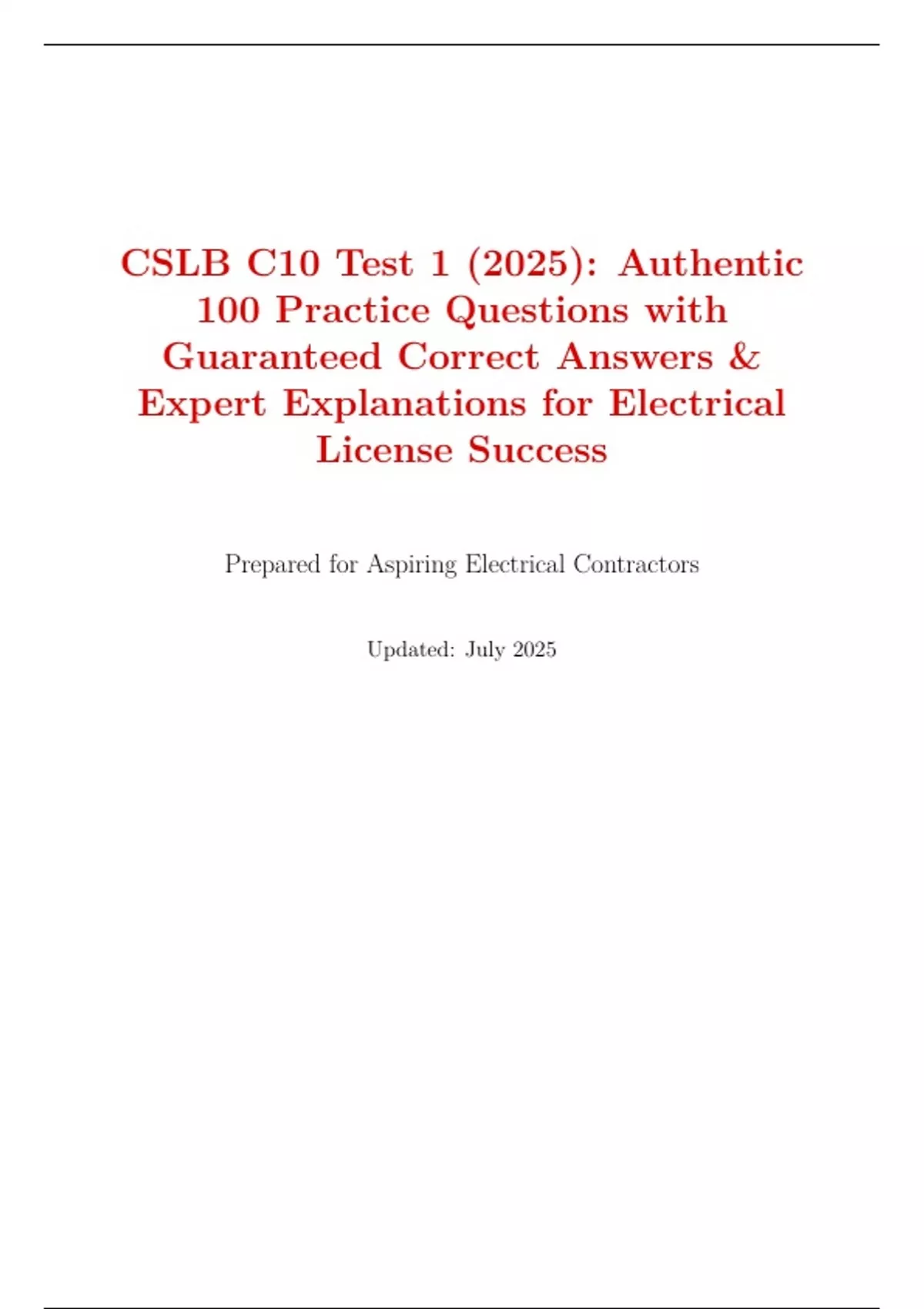 CSLB C10 Test 1 (2025): Authentic 100 Practice Questions with Guaranteed Correct Answers & Expert Explanations for Electrical License Success Prepared for Aspiring Electrical Contractors Updated: July 2025 Introduction This document provides 100 practice questions designed to prepare candidates for the CSLB C-10 Electrical Contractor License Exam in 2025. Each question includes a correct answer and a detailed explanation to ensure a deep understanding of electrical concepts, National Electrical Code (NEC) requirements, safety practices, and practical applications. The questions are structured to cover key areas tested in the exam, with a focus on clarity and relevance.