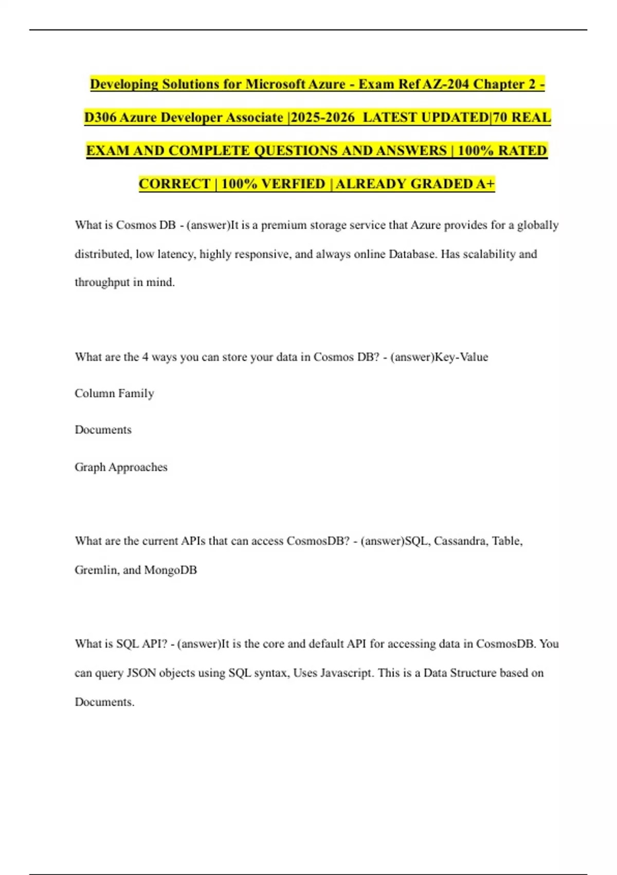 Developing Solutions for Microsoft Azure - Exam Ref AZ-204 Chapter 2 - D306 Azure Developer Associate | LATEST UPDATED|70 REAL EXAM AND COMPLETE QUESTIONS AND ANSWERS | 100% RATED CORRECT | 100% VERFIED | ALREADY GRADED A+