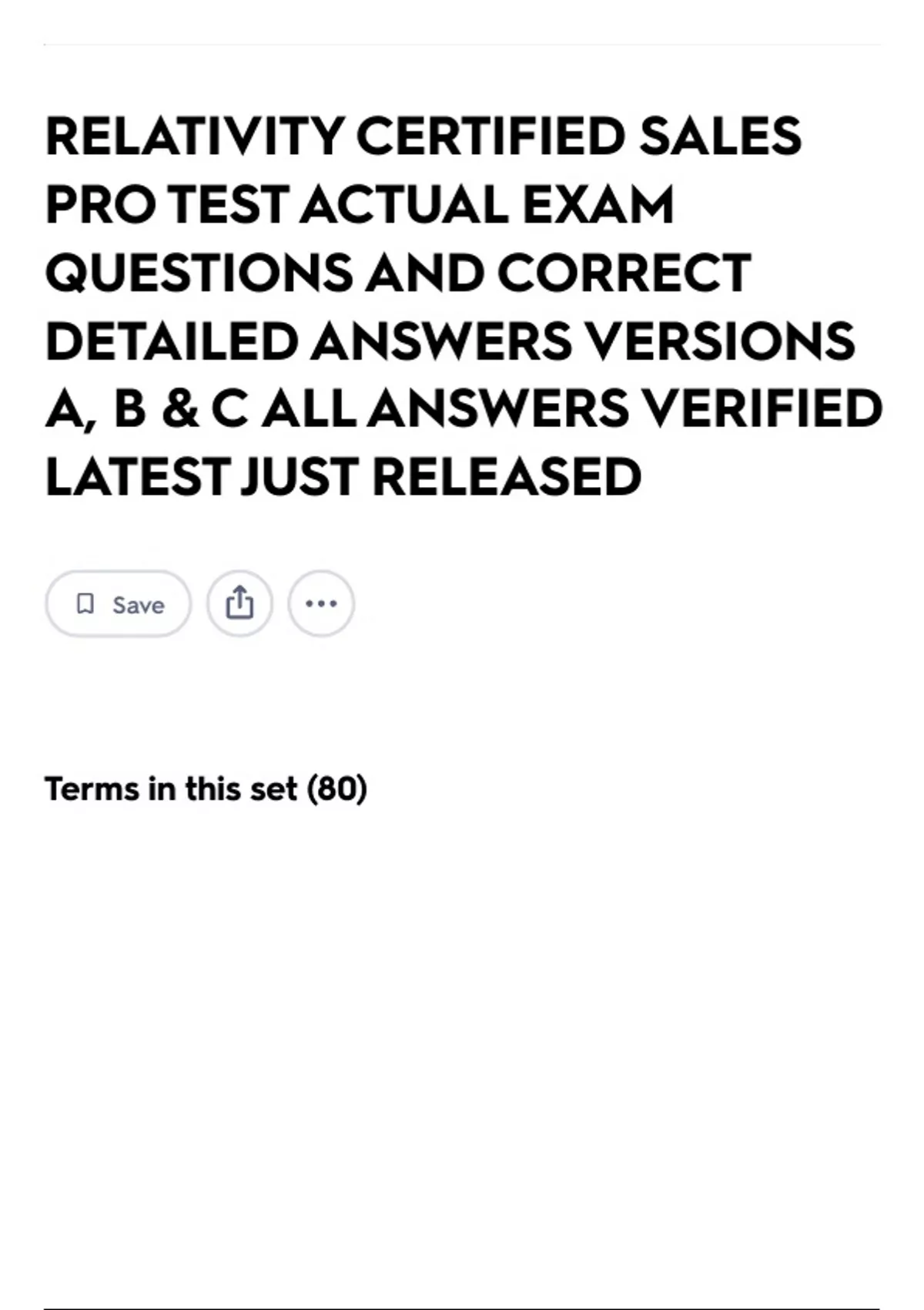 RELATIVITY CERTIFIED SALES PRO TEST ACTUAL EXAM QUESTIONS AND CORRECT DETAILED ANSWERS VERSIONS A, B & C ALL ANSWERS VERIFIED LATEST JUST RELEASED