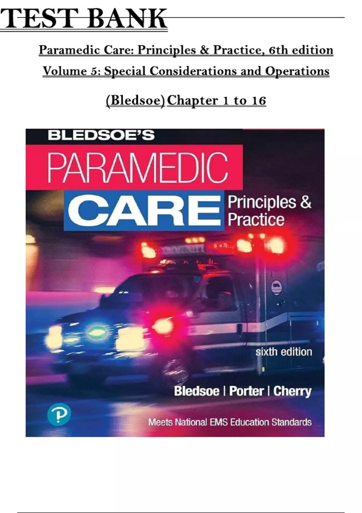 This document is the complete test bank for Paramedic Care: Principles & Practice, Volume 5 (6th Edition) . It includes comprehensive multiple choice questions and scenario-based items focused on advanced EMS topics such as special patient populations, acute care procedures, pediatrics, geriatrics, abuse, and behavioral emergencies. The questions are organized by chapter and aligned with national EMS educational standards, making it ideal for exam prep, review, and classroom testing.