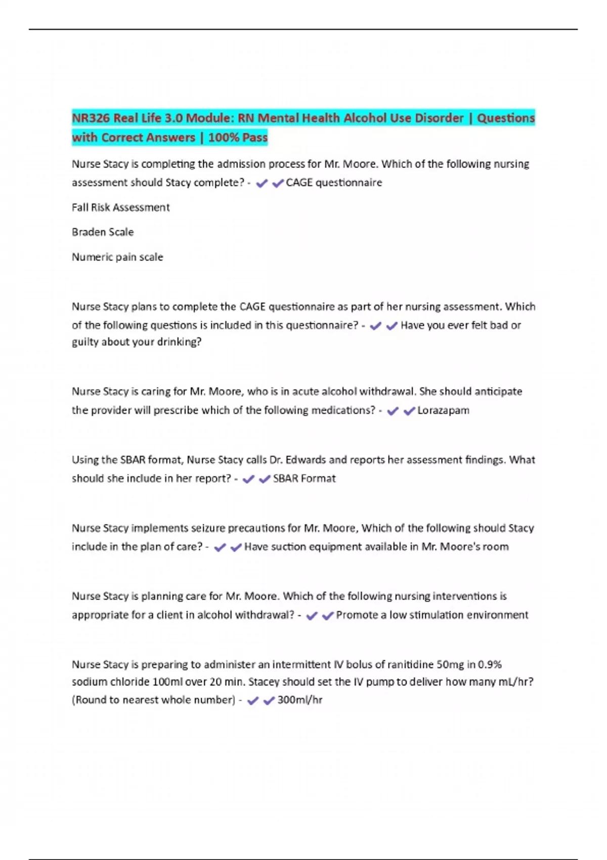 NR326 Real Life 3.0 Module: RN Mental Health Alcohol Use Disorder | Questions with Correct Answers | 100% Pass