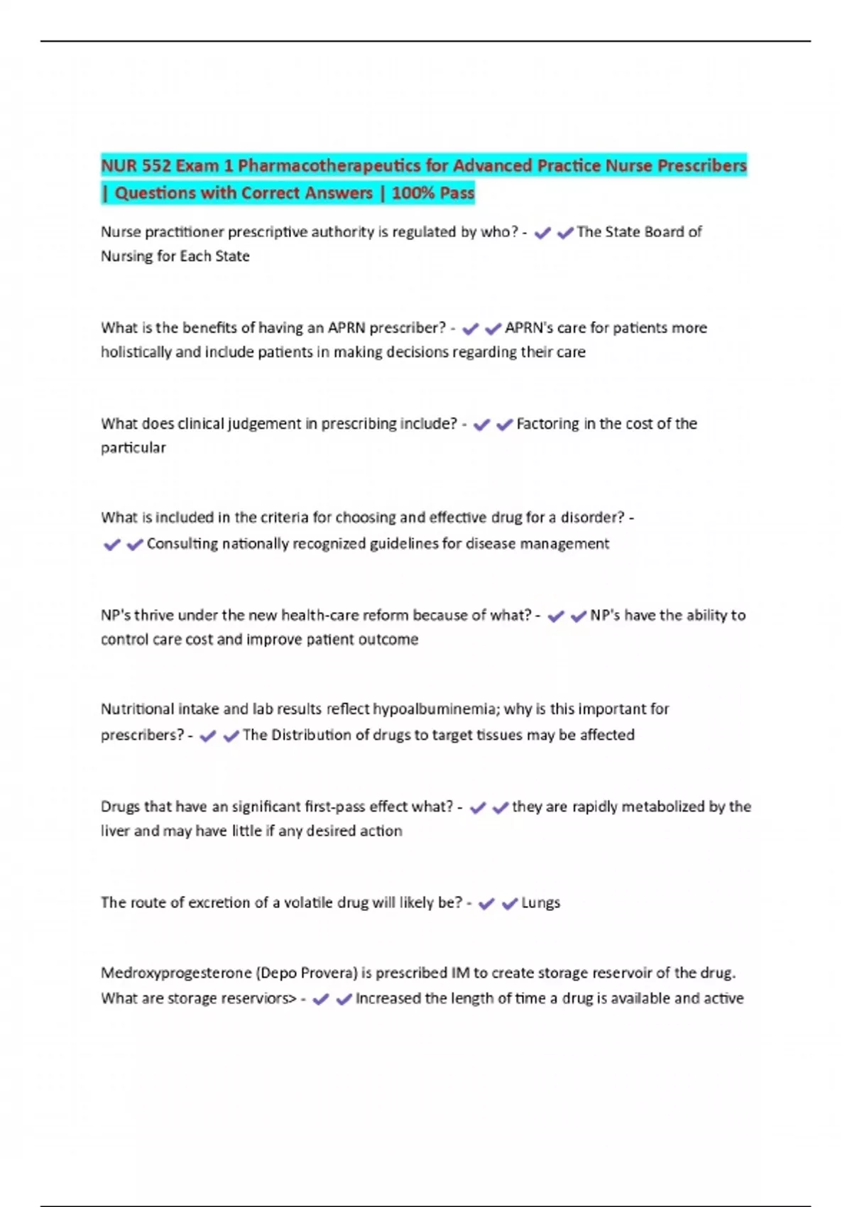 NUR 552 Exam 1 Pharmacotherapeutics for Advanced Practice Nurse Prescribers | Questions with Correct Answers | 100% Pass