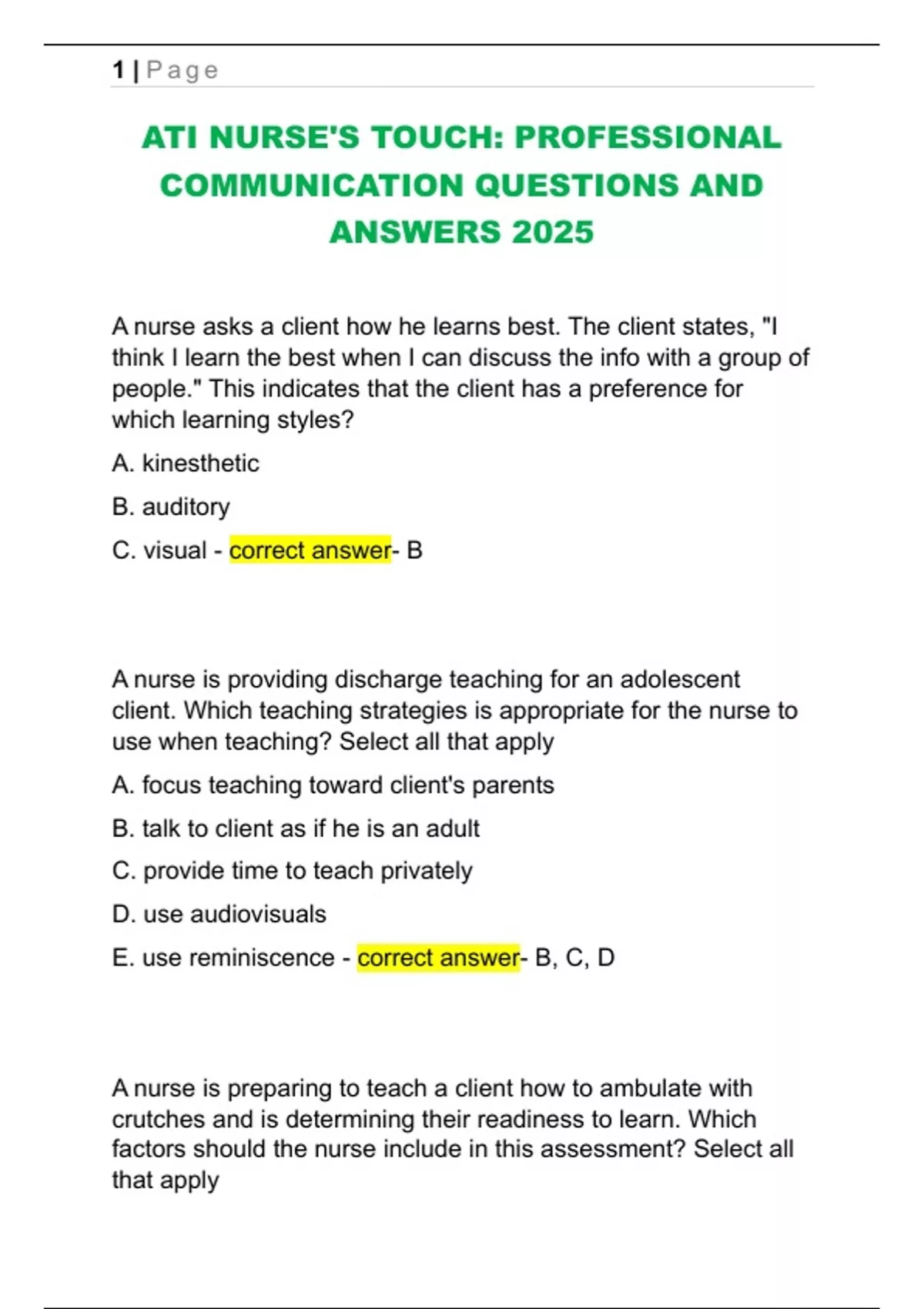 ATI NURSE'S TOUCH: PROFESSIONAL COMMUNICATION QUESTIONS AND ANSWERS 2025