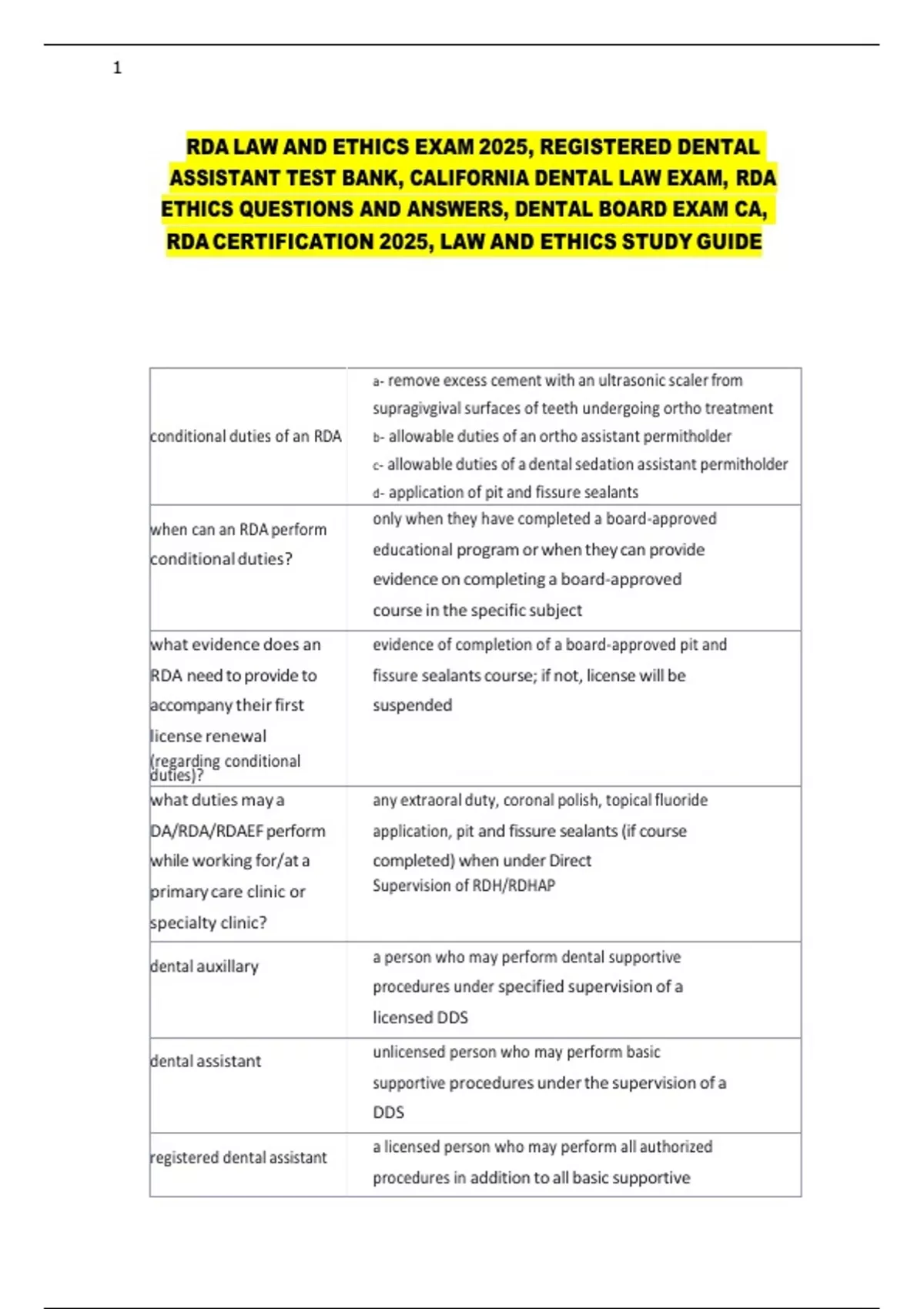 RDA LAW AND ETHICS EXAM 2025, REGISTERED DENTAL