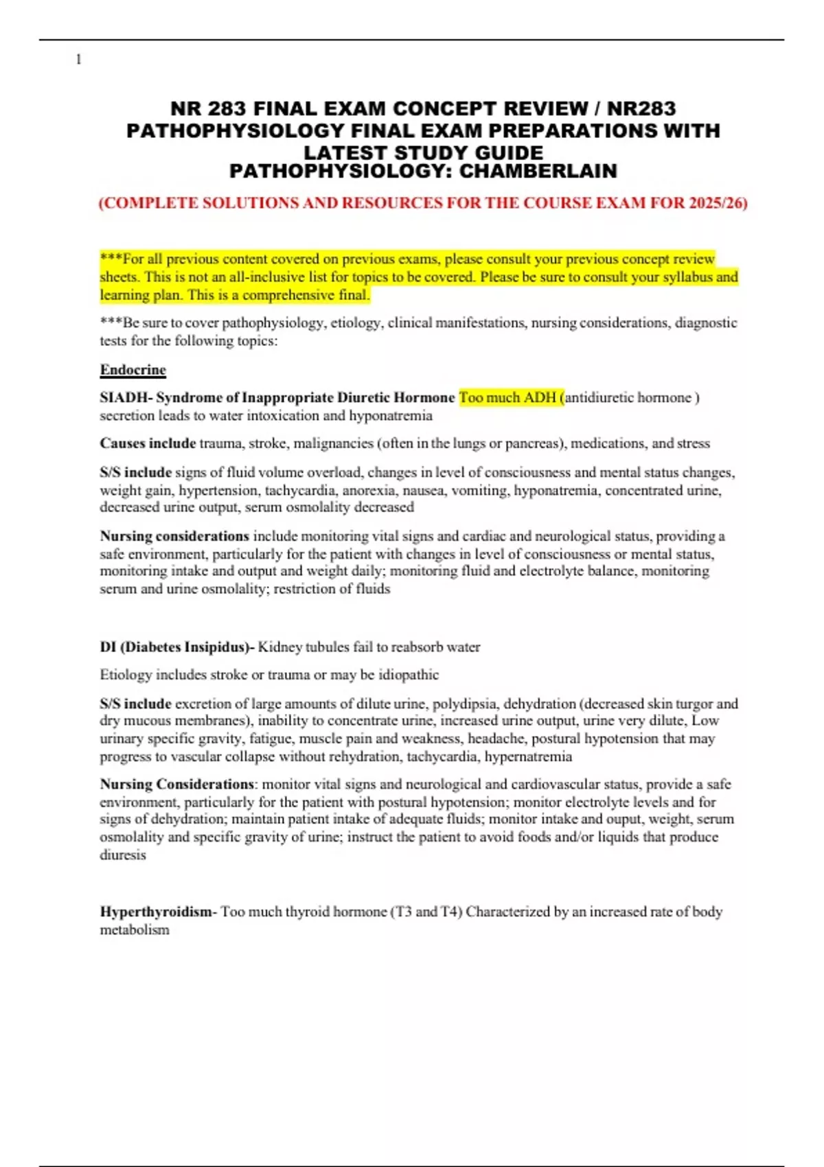 NR283 PATHOPHYSIOLOGY FINAL EXAM PREPARATIONS WITH LATEST STUDY GUIDE