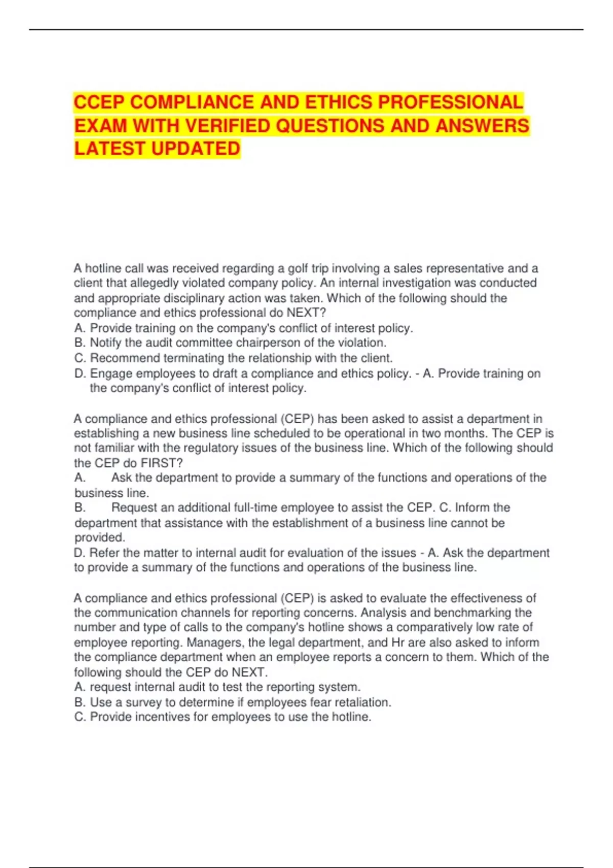 company's compliance and ethics professional (CEP). Which of the following should the