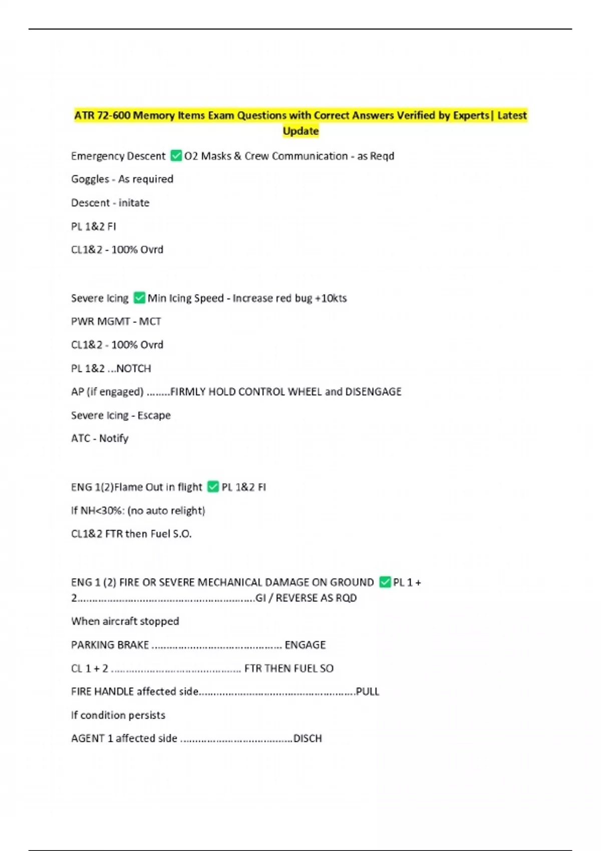 ATR 72-600 Memory Items Exam Questions with Correct Answers Verified by Experts| Latest Update