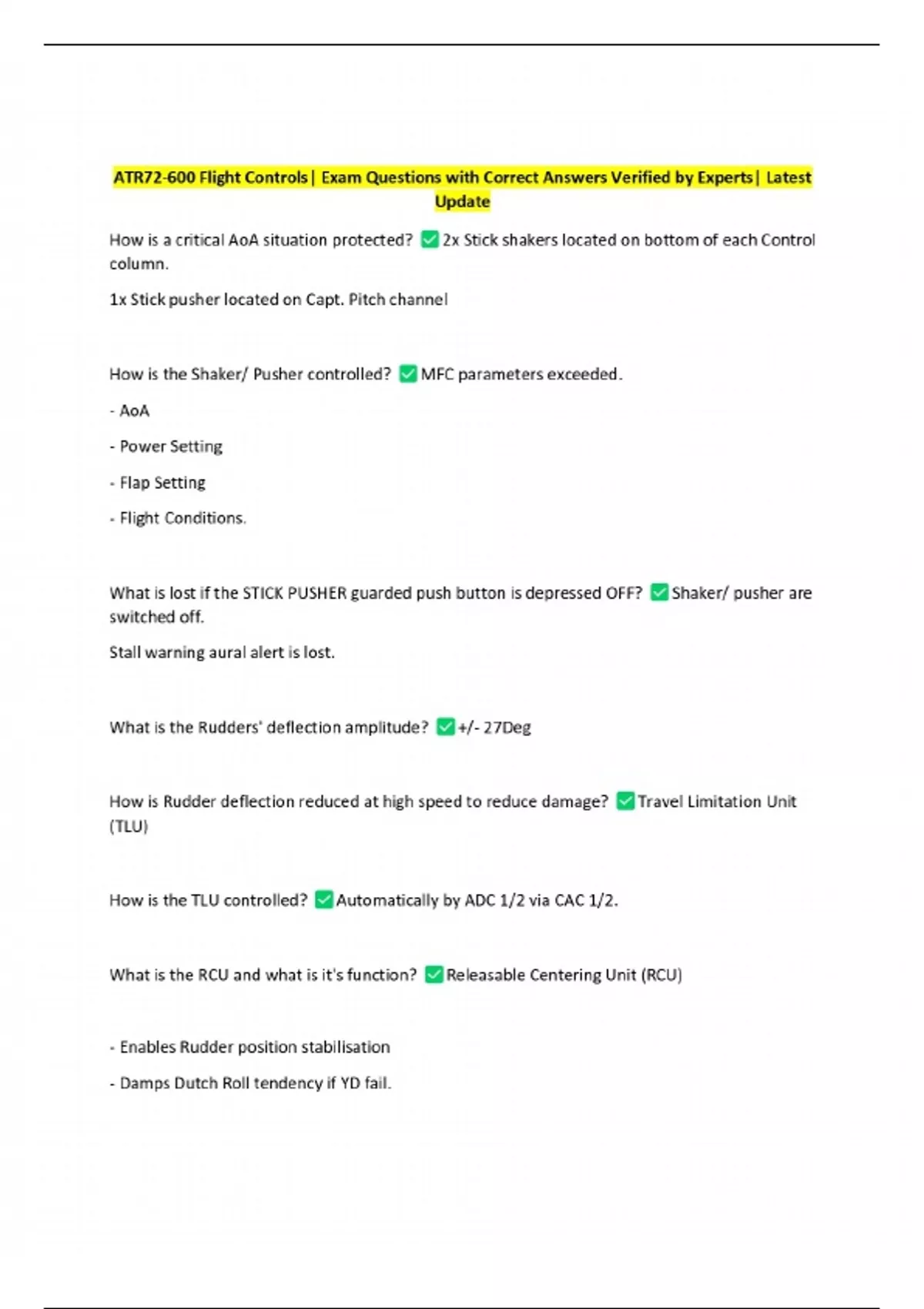 ATR72-600 Flight Controls| Exam Questions with Correct Answers Verified by Experts| Latest Update