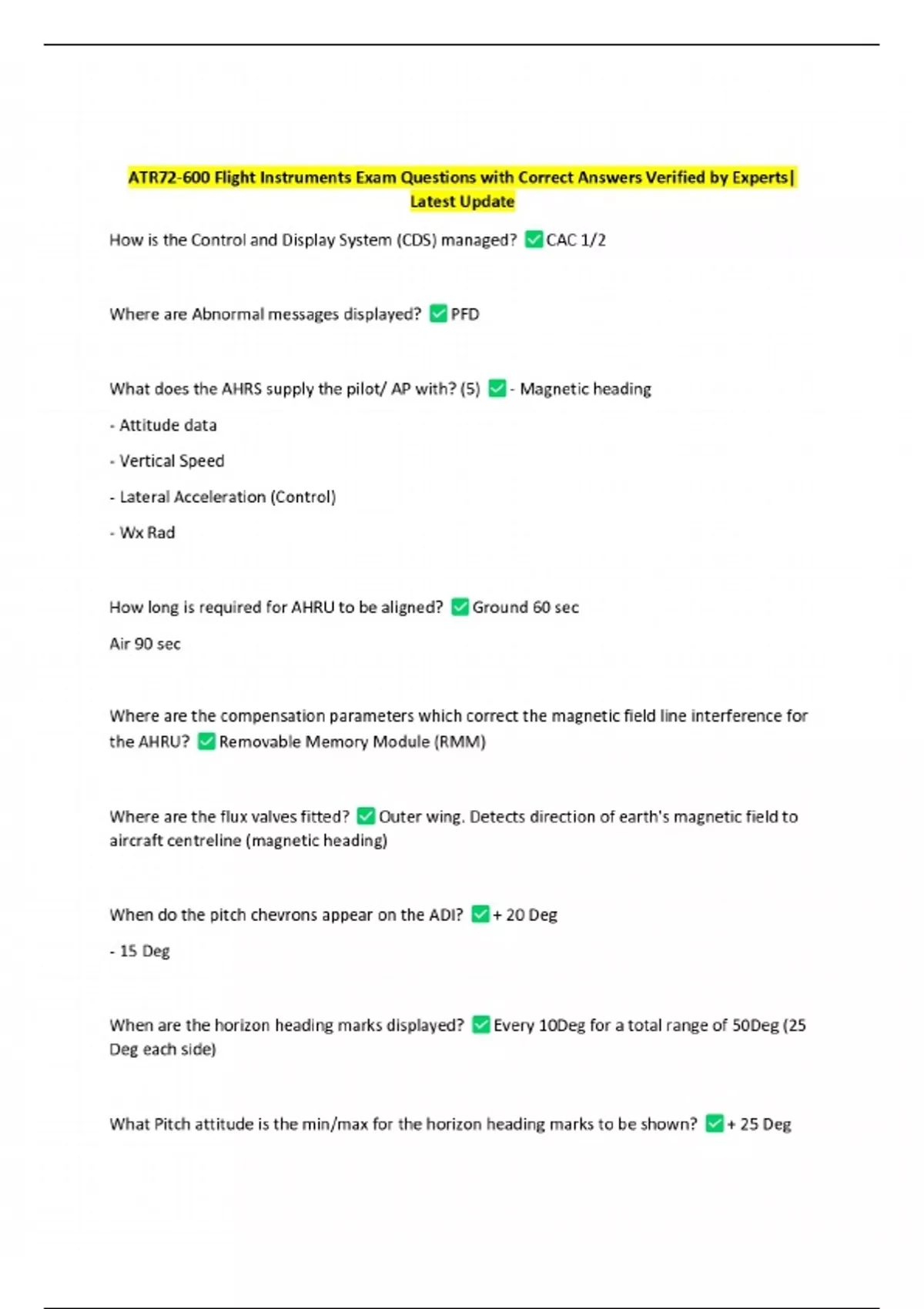 ATR72-600 Flight Instruments Exam Questions with Correct Answers Verified by Experts| Latest Update
