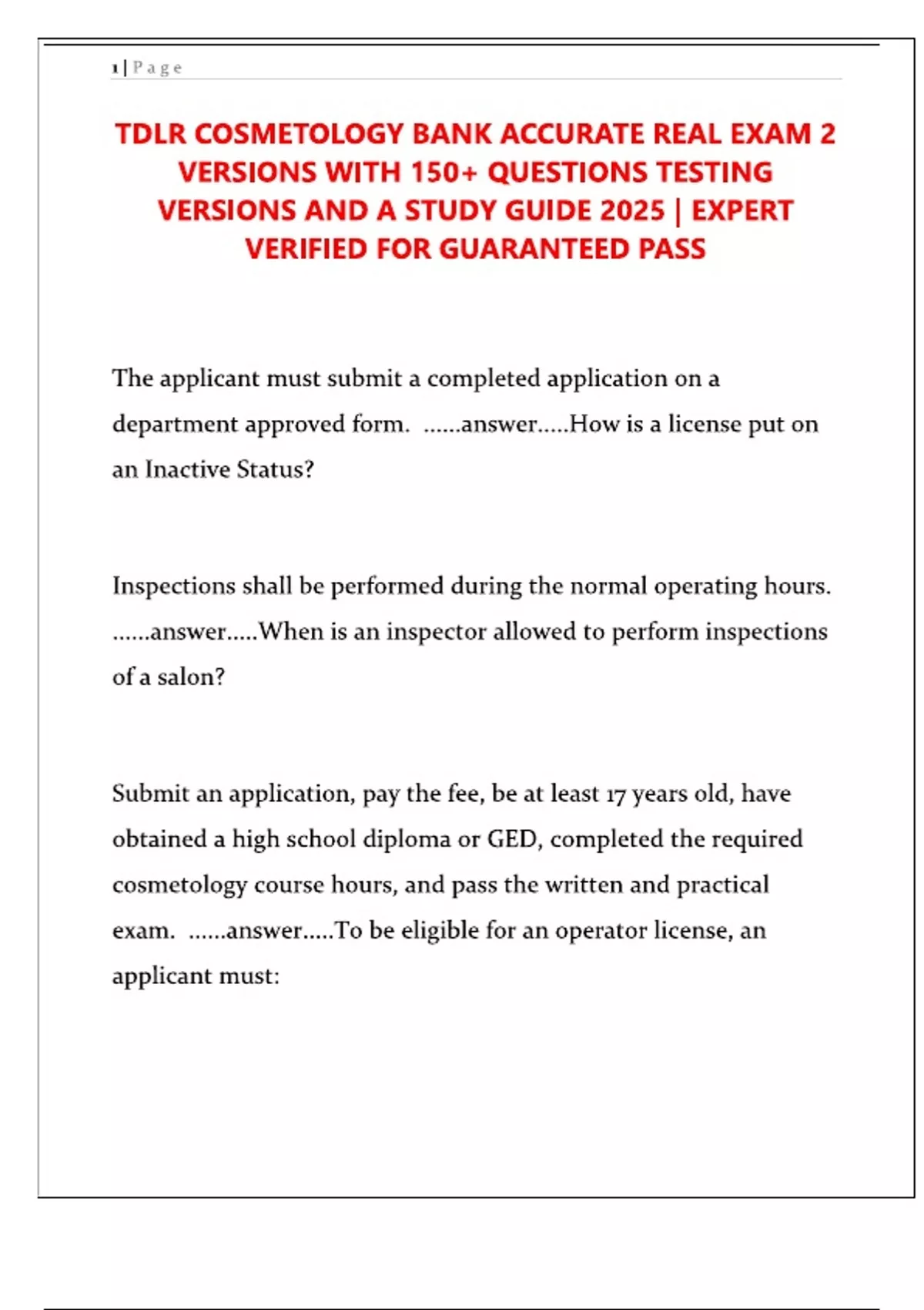 TDLR COSMETOLOGY BANK ACCURATE REAL EXAM 2 VERSIONS WITH 150